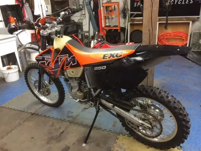 02 KTM 250 EXC with low hours. This bike needs nothing. It was ridden very little and maintained well. It has always been garaged. Mileage is unknown since the tripometer is reset-able. When I bought the bike a few years ago. it had never had a skid plate or bark busters installed. What this means is that it was never abused in normal woods use. I bought it to use as a spare bike just incase my regular bike had a major issue. I only needed to ride the bike one time. It runs great and is very reliable. I added a used set of Bark busters and used skid plate that I had laying around. The skid plate had existing damage from the previous bike it was mounted on. It has a split in it where the left wing protects the case. shown in pics. It still serves it purpose. The motor has plenty of power. the chain and 13/52 sprockets are in good shape and the tires are new Michelin Cross Comp S12 XCs with only one ride on them. The sintered brake pads are new with one ride on them. Pro Taper bars. Factory TripOmeter. ead light and tail light both work. synthetic Oil is fresh. Air cleaner is clean and oiled. The bike starts easily with the electric start or kick starter. This bike is sold with it's original Certificate of Origin. The cert does not say "For off road use only" so it can easily be used to title the bike for the road in most states. I travel to New Hampshire ever couple weeks to go riding. I could possibly bring this bike along and deliver it somewhere along the way from CT to NH.