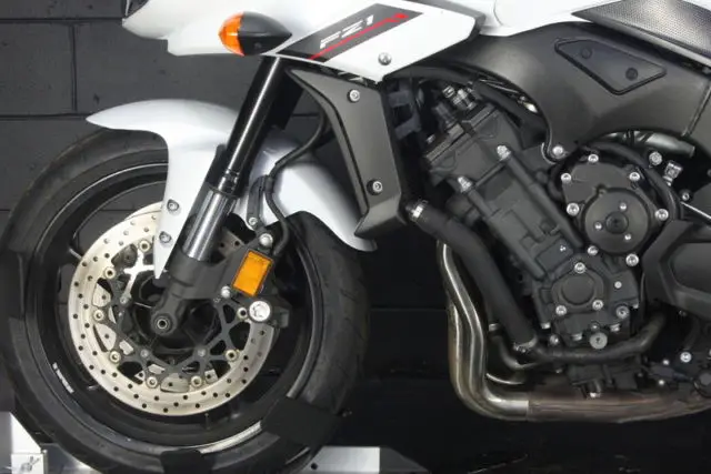 Vehicle Specs General Year: 2012 Manufacturer: Yamaha Model Name: FZ1 Trim Name: Base Generic Type (Primary): Sport Engine Engine Type: 998cc liquid-cooled inline 4-cylinder; DOHC, 0 valves Bore: 77 mm Stroke: 53.6 mm Compression Ratio: 11.5:1 Fuel System: Fuel injection Ignition: Digital TCI: Transistor Controlled Ignition with 32-bit ECU Transmission: 6-speed w/multiplate clutch Final Drive: O-ring chain Chassis Front Suspension: 43mm fork; fully adjustable, .1-in travel Rear Suspension: Single shock; adjustable preload and rebound damping, .1-in travel Front braking system: Dual 320mm floating discs w/4-piston calipers Rear braking system: 245mm disc w/single-piston caliper Front Tires / Model: 120/70-ZR17 Rear Tires / Model: 190/50-ZR17 Dimensions Length: 84.3 in Width: 30.3 in Height: 47.4 in Seat Height: 32.1 in Wheelbase: 57.5 in Ground Clearance: 5.3 in Rake (steering head) (deg): 25.0° Trail: 4.3 in Fuel Capacity: 4.8 gal Fuel Economy: Combined City/Hwy: 35 mpg Weight, n Running Order: 487 lb Other Warranty: 1 Year (Limited Factory Warranty) View More Details