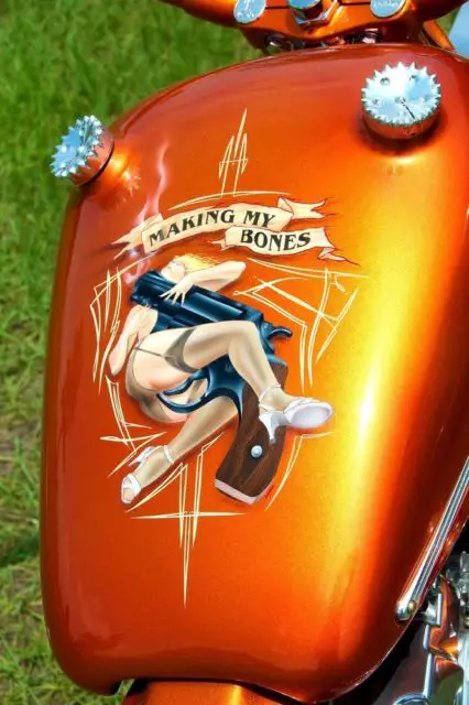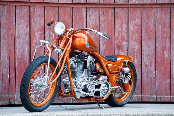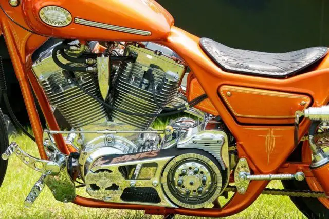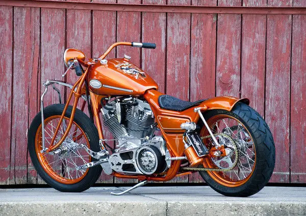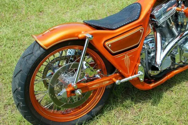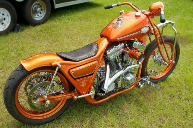 CUSTOM BUILT BOBBER BY JOHN DODSON OF GANGSTER CHOPPERS OF VIRGINIA. JOHN PERSONALLY DESIGNED AND BUILT THIS BIKE FROM SCRATCH. MOST ALL THE PARTS ON THE BIKE WHERE MADE BY HIM. I PURCHASED BIKE ON JULY 19, 014. FROM JOHN DODSON. I HAVE BEEN COLLECTING MOTORCYCLES 35 YEARS NOW. WHEN I SAW THIS BIKE FOR SALE I COULD NOT STOP LOOKING AT IT ! ITS GOT THAT GREAT OLD FEEL IN A MODERN WORLD .....THE BIKE RIDES LIKE A DREAM ! BY FAR THIS IS THE MOST FAVORITE BIKE I EVER OWNED. THE DETAIL GOES ON FOR EVER ON THIS BIKE. EVERY PIECE HAND MADE AND DESIGNED AS ONE OF A KIND. FROM THE GAS CAPS ON TANK. PUSH ROD SPACERS MADE OF BRONZE SCULPTURES. ONE OF A KIND OLD SCHOOL SPRINGER FRONT END. THE ORANGY GOLD PAINT THAT SOME WHAT HAS A MONOCHROMATIC SCHEME TO IT. MAKES THE BIKE LOOK LIKE A MILLION BUCKS ! NO DETAIL OF QUALITY WAS SPARED. JOHN DODSON OR ANYONE ELSE COULD NOT HAVE DONE ANY BETTER IN ANYWAY . BUILT ON A 1994 FXR FRAME AND MOTOR THIS BIKE WAS DONE RIGHT. VERY FEW MILES ON BIKE. BIKE IS IN SHOWROOM NEW CONDITION .MOTOR AND TRANNY ARE STILL FRESH . NO STORYS ON THIS BIKE. DECIDED TO SELL BECAUSE I HAVE TO MANY BIKES SOMETHING HAS TO GO .THIS BIKE WAS BUILT AND COMPLETED IN 2013. WAS FEATURED IN AMERICAN IRON HORSE MAGAZINE IN SEPT 2013 ISSUE. ALSO IN MANY OTHER PUBLICATIONS. AS BARNETT'S MAGAZINE, OOSIER DADDY CHOPPERS AND OTHERS. THERE WAS NO MONEY SPARED ON THIS BUILD. JOHN TAKES PRIDE IN EVERY BIKE HE BUILDS. THIS IS BY FAR ONE OF HIS FINEST CREATIONS ! CONDITION ; EXCELLENT ORIGINAL CONDITION AS BUILT. I HAVE PUT LESS THAN 200 MILES ON IT SINCE I OWNED IT. RUNS PERFECT. OVERALL IN SHOWROOM CONDITION.HAD TO REPLACE MY IGNITION OR POINTS COVER.IT WAS A GIFT {INDIAN CHIEF} HEAD . I REPLACED IT WITH A CUSTOM COVER THAT MATCHES BIKE PERFECTLY. PLEASE SEE LAST PHOTO TO SEE NEW COVER. PLEASE REVIEW MY PHOTOS AND PLEASE EMAIL ME WITH ANY QUESTIONS ? BUYER PAYS SHIPPING. I WILL HANDLE THE TRANSPORTER AND MAKE SURE BIKE GETS ON TRAILER. BEEN ON EBAY SINCE 1995 . 100% POSITIVE FEEDBACK. JUST THINK WHAT IT WOULD COST YOU TO BUILD THIS BIKE TODAY ! $35,000.00 TO $50,000.00 ?
