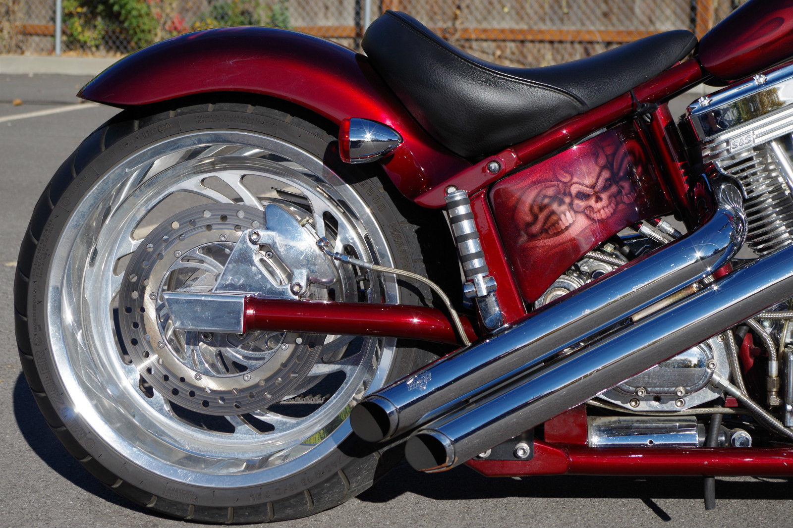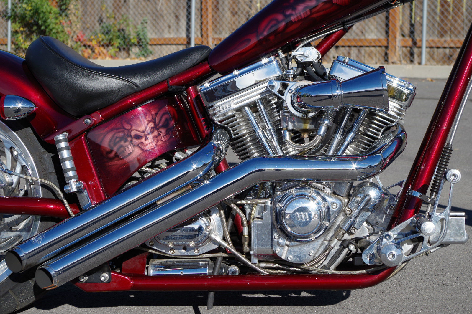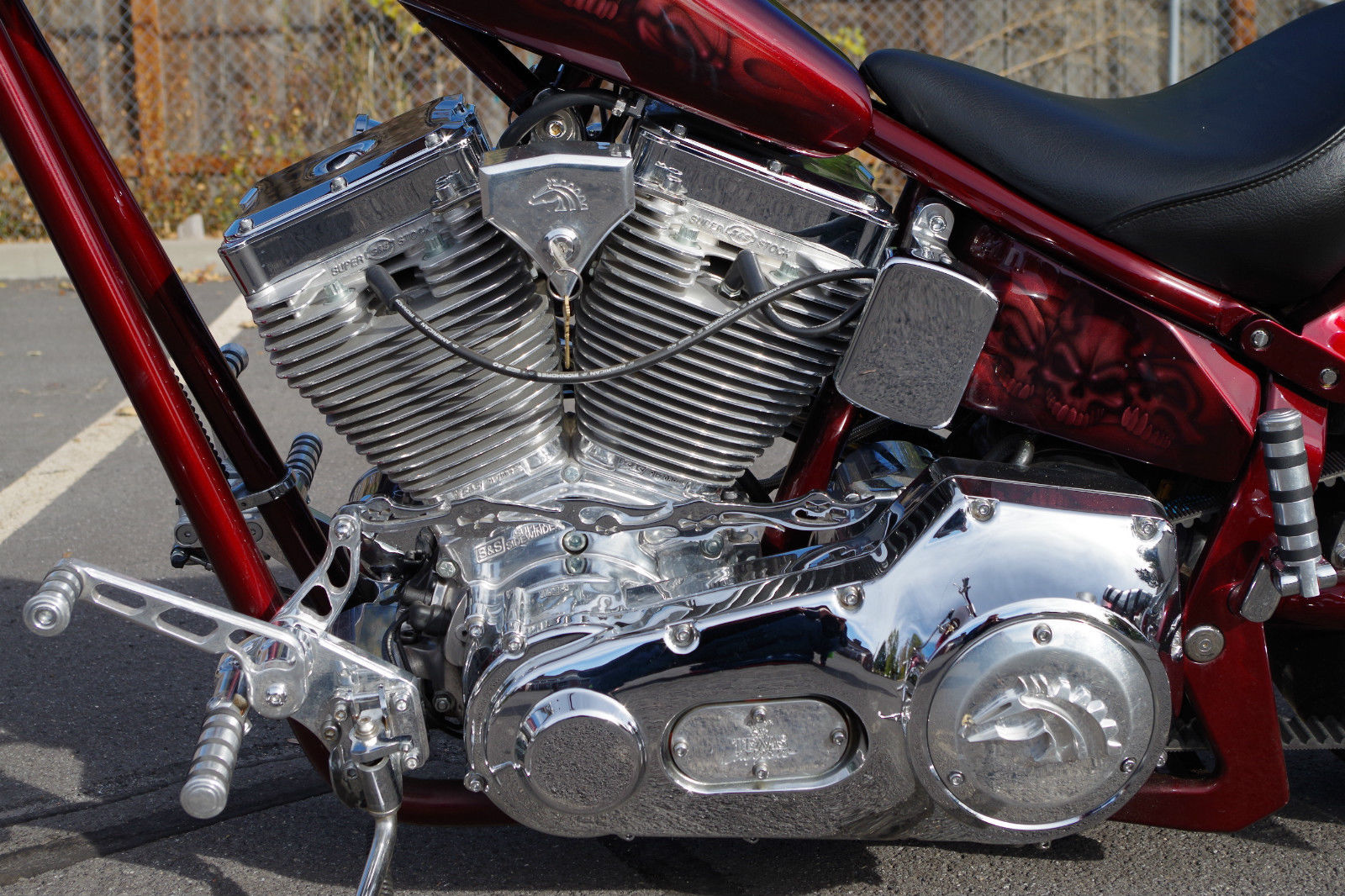 Up for sale is a 2004 American Ironhorse Texas Chopper Softail Motorcycle with LOW LOW 4. 29 WELL CARED FOR MILES! The Texas Chopper offers the outstanding looks of a Hard-Tail Chopper. but rides like a dream with its Soft-Tail Suspension.  This bike is EXTREMELY comfortable to ride! This bike is in GREAT CONDITION and has clearly been taken extremely well care of over the course of its life.  The Highly Desirable Beautiful Black Cherry Metallic Base Paint Job with Ghost Flames & Skull Air Brushing is absolutely beautiful.  The paint job is ABSOLUTELY GORGEOUS! There is Chrome & Polished Billet everywhere on this bike.  The bike is equipped with the Very Powerful Carbureted 111 Cubic Inch 1. 19 CC S&S V-Twin Motor. Six Speed Transmission. Dual Front Disc Brakes. Rear Disc Brake. ETC.  This bike has PLENTY OF POWER! It is equipped with the Vance & Hines Exhaust that sounds & looks absolutely amazing! The bike is equipped with Custom Air Intake. Rear Passenger Pegs. Leather Barrel Gear Bag. Upgraded Dakota Digital Speedometer. Custom Flamed Mirrors. Custom Flame Gear Shifter Linkage. Custom Forks. ETC.  It is equipped with a 21" rim up front & an 18" rim in the rear mounted on a HUGE 240 series tire that looks absolutely outstanding.  This chopper was nearly $44k just 10 years ago.  Get a really nice bike for a FRACTION of a BRAND NEW PRICE! Email or call Chase at (801)564-0629 for any questions or to set up an appointment to view the chopper.  The chopper is located in Kaysville. Utah which is 20 miles North of Salt Lake City. Utah.