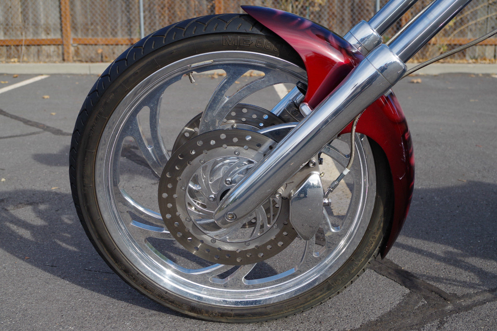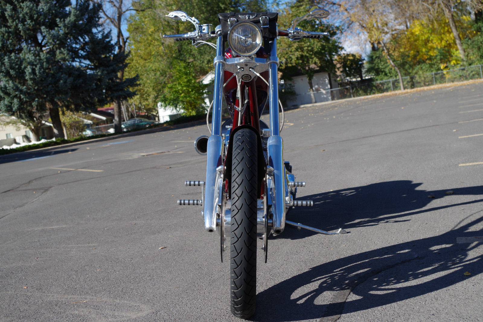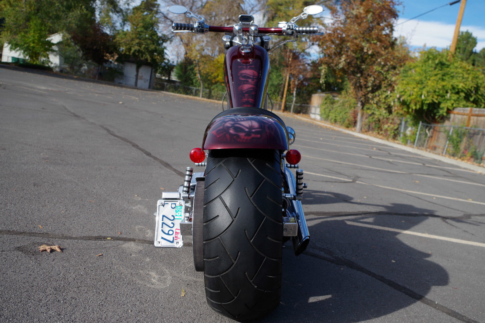 This Texas Chopper is in Great Condition! I would rate the bike at a 9. 25 out of a 10! Definitely an eye catching American Ironhorse and is extremely unique! I haven't seen any like this one! The Highly Desirable Beautiful Black Cherry Metallic Base Paint Job with Ghost Flames & Skull Air Brushing is in great condition! I'm definitely a fan! The under carriage of the frame has some minor scrapes from entering a driveway.  There are a few light surface scratches as shown in the video. but nothing too crazy.  There is a minor 1/4" scratch on the bottom of the rear side of the front fender.  There are also 3 light hair line scratches on the rear fender.   The pipes have some scuffing on the bottom edge of the pipes.  The polished billet on the pegs & wheels are in good shape. but will need some polishing to look perfect.  Both the front & rear Metzeler Tires are in good shape & should give you 2-3 more additional seasons of riding.  The front turn signal lights have been taken off by a previous owner to clean up the look of the bike.  I just want to make sure I disclose as much as possible.  The bike comes with one key.  The bike runs perfect and is an absolute blast to ride! You won't be disappointed! It does have a Clean & Clear Title.  If you have any questions or would like to see the bike in person please email or call Chase at (801)564-0629.