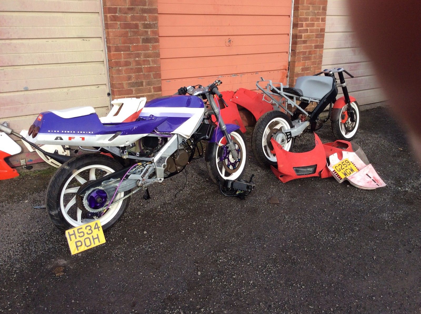 Here is my Aprilia af1 125 sintesi 90% done have been doing up now for ages no expense speared the one with the purple bits on as had full engine rebuild con rod kit big and small end bearings plus every gear box main bearings and barrel renicksealed since that asnt been rode or warn in all brakes fork seals new loads parts been powder coated Cadbury purple calipers clutch cover brand new rad power valve chain plus sprockets ect ect loads of money spent all that it needs is fairing sortedMetal number plated goodrige hosesA lot off stuff arrow chamber Af1 futura With these sale is also an other aprilia af1 futra with loads of new parts like tyres brake hashes I used it as a do?a but a very good bike sprockets new all it needs is engine and wiring loom realy that's all it has full set fairing needs painting More info Email otoA lot off new parts in wrappers a lot more parts in boxes