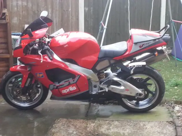 Aprillia rsv milliei am selling my beloved rsv millie 51plate 2002she is in excellent condition i am only selling her as i hoped to be able to ride her again but due to medical reasons this is not going to possible. she is currently on a sorn. her mot excpires on 24/3/2015 i had her motd last year hoping to put her back on the road but unfortunatley i was un able to her mileage at the time was 5046 miles and she has not done any miles since than so will have no problems going through her next mot. she starts and runs fine and she is a credit for any ownerexcellent condition 1000cc vtwin so is very powerful and handles brilliantly just shows why aprillia won so many championships in her day. i have all the original book pack2 keysshe comes with part service history. i will also supply new oil filter and oil to winning bidder. new battery i replaced it last year for her mot. original and performance exhaustoriginal and reduced size number plate. original clear and double bubble tinted screen. rear racer pod and rear seatpolished frame . swinging arm . wheels. custom one off rear hugger (well i have never seen another one the same)she doesnt have an alarm but i do have a certificate for a datatool cat 1 systemfull racing clocks so you can do your lap time highest speed avg speed distance etc etc etci have taken her down to my local motorycycle dealership and the sales manager said she is worth retail at between 3200 to 3500 poundshence i have set reserve at 2000 pounds so you are getting a bargain. i want her to go to a good home and it is unfair for her to be just sat in my shed. any viewings welcometest drives are welcome but as i have said she is on a sorn and i do have a no cash no test drive policy (just to prevent time wasters and if you bin her youve bought her. )cash on collection only. any questions please feel free to ask. thanks for looking.
