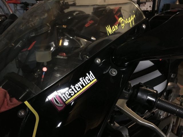 I'm the fourth owner of this original Max Biaggi Chesterfield (not a sticker kit replica). I bought her from a good friend that needed a car for his growing family. This was THE bike I originally wanted when I first got into motorcycles. 18 years or so and a lot of bikes later, was lucky enough to get my hands on this wonderful machine.