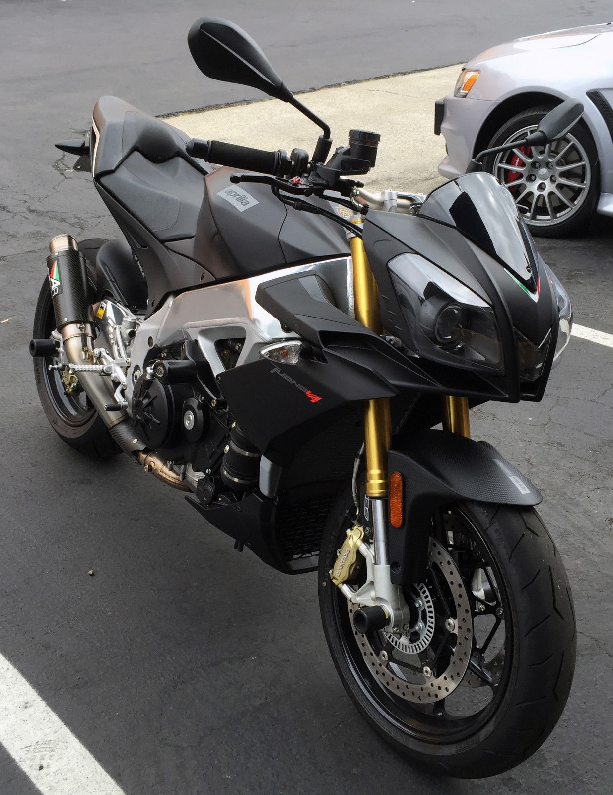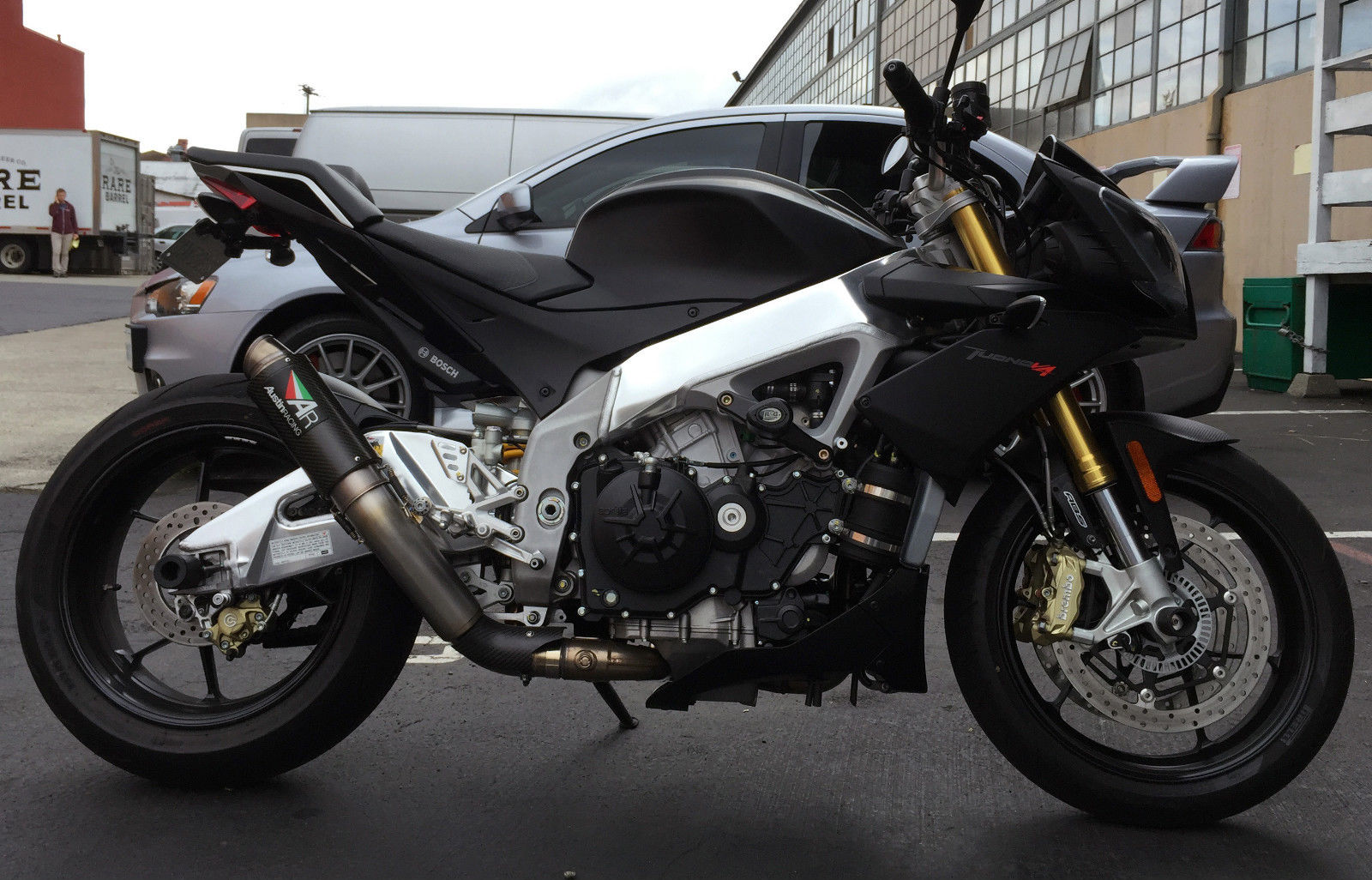 I have a loan through Aprilia and it would have to be paid off and title would follow. 1450 milesCRG shorty clutch and brake levers. breakaway. Evotech tail-tidy. Front and rear axle sliders. R&D Engine sliders. Aprilia smoked windscreen. Austin Racing carbon GP2 slip on. Aprilia race ECU. 2014 Aprilia Tuono V4 R APRC ABS Technical Specifications:Engine:Engine type: Aprilia longitudinal 65?° V-4 cylinder. 4-stroke. liquid cooling system. double overhead camshafts (DOHC). four valves per cylinderBore and stroke: 78 x 52. 3 mmTotal engine capacity: 999. 6 ccCompression ratio: 13:1Maximum power at crankshaft: 167 HP (125 kW) at 11. 00 rpmMaximum torque at crankshaft: 111. 5 Nm at 9. 00 rpmFuel system: Airbox with front dynamic air intakes; 4 Weber-Marelli 48-mm throttle bodies with 4 injectors and latest generation Ride-by-Wire engine management. Choice of three different engine maps selectable by the rider with bike in motion: T (Track). S (Sport). R (Road)Ignition: Magneti Marelli digital electronic ignition system integrated in engine control system. with one spark plug per cylinder and "stick-coil" type coilsStart up: ElectricExhaust system: 4 into 2 into 1 layout. single oxygen sensor. lateral single silencer with ECU-controlled bypass valve and integrated trivalent catalytic converter (Euro 3)Alternator: Flywheel mounted 450W alternator with rare earth magnetsLubrication: Wet sump lubrication system with oil radiator and two oil pumps (lubrication and cooling)Gearbox: 6-speed cassette type gearbox: 1st: 39/15 (2. 00); 2nd: 33/16 (2. 063); 3rd: 34/20 (1. 00); 4th: 32/22 (1. 55); 5th: 34/26 (1. 08); 6th: 33/27 (1. 22); Gear lever with Aprilia Quick Shift electronic system (aQS)Clutch: Multiplate wet clutchPrimary drive: Straight cut gears and integrated flexible coupling. drive ratio: 73/44 (1. 59)Secondary drive: Chain: Drive ratio: 42/16 (2. 25)Traction management: APRC System (Aprilia Performance Ride Control). which includes Traction Control (aTC). Wheelie Control (aWC). Launch Control (aLC). all of which can be configured and deactivated independently. Chassis:Aluminum dual beam chassis with pressed and cast sheet elements. Steering Damper: SachsFront suspension: Sachs upside-down "one by one" fork. stanchions 43 mm. Forged aluminum feet for radial calliper mounting; Completely adjustable spring preload and hydraulic compression and rebound damping; Wheel travel: 120 mmRear suspension: Double braced aluminum swingarm; mixed low thickness and sheet casting technology; Sachs piggy back monoshock with completely adjustable: spring preload and hydraulic compression and rebound damping. APS progressive linkage; Wheel travel: 130 mmFront Brakes: Dual 320 mm floating stainless steel discs with lightweight stainless steel rotor with 6 studs. Brembo monobloc radial callipers M432 with 4 horizontally opposed 32 mm £ pistons. Sintered pads. Axial pump master cylinder and metal braided brake hoses. Rear Brakes: 220 mm diameter disc; Brembo floating calliper with two 32-mm isolated pistons. Sintered pads. Pump with integrated tank and metal braided hose. ABS: Bosch 9MP. adjustable on 3 maps. featuring RLM strategy and disconnectable. Wheel rims: Cast aluminum wheels with 3 split spoke design: Front. :3. 5"X17"; Rear: 6. 00"X17"Tires: Radial tubeless. Front: 120/70 ZR 17; Rear: 190/55 ZR 17 (alternative: 190/50 ZR 17; 200/55 ZR 17)Dimensions?ˆ?:Max. length: 81. 2 inchesMax. width: 31. 4 inches (at the handlebar)Max. height: 42. 9 inchesMin. height from the ground: 4. 9 inchesSaddle height: 32. 8 inchesWheelbase: 56. 8 inchesTrail: 4. 2 inchesSteering angle: 25?°Dry weight: 408 lbsTank: 18. 5 liters (4. 88 gallons)