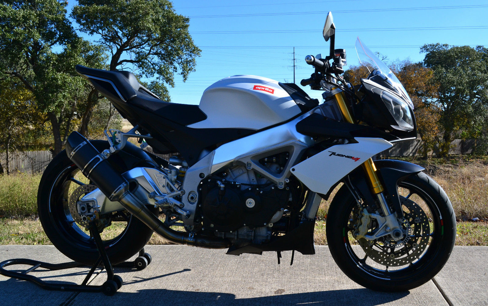 1000cc V-Twin. 167 HP and 82 lb-ft of torque. This bike goes and more features than you know what to do with. + Traction Control+ Wheelie Control+ Launch ControlTons of upgrades:+ SC Performance exhaust (carbon-fiber)+ Factory race mapping+ Rizoma mirrors+ Rizoma turn signals+ Rizoma bar end+ Factory upgraded windscreen+ Fender eliminator+ Upgraded 4 gallon fuel tank5. 00 miles. always garaged and serviced at AF1 racing. Proper break-in and perfect condition. Beautiful matte white finish. Not a scratch on the bike. Rear tire has only 250 miles on it. 2012 Best Superbike of the yearIf you have one ounce. one molecule. one scintilla of hooliganism in you. the Tuono will bring it out faster than you can say. "But officer. . . " Try--just try--to ride this bike very far without snapping up the longest. easiest wheelie you've ever attempted. What? You say you don't care about such things? Okay. but are you intrigued by the Tuono's ability to accelerate like a medieval shoulder-separating device while bellowing a V-Four exhaust shriek that sends chills up and down your spine? And cornering? Fuhgettaboutit! Betcha that on most backroads. especially if they're a little tight. you could embarrass most riders of repli-racers without breaking a sweat. Yeah. it's that goodTitle in hand. Serious offers only. BMW s1000r Ducati GSXR streetfighter Honda Kawasaki V4R