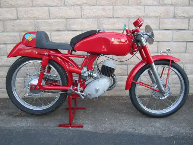 Very interesting vintage Benelli. This 1956 Leoncino (Little lion) is a 3 speed 125 two stroke. Extensively modified in the 1980s for vintage club racing. It has the higher performance Sports engine with a Pollini race kit with the 28mm DellOrto carb feeding directly into the crankcase. Custom tank and seat plus many other period mods. This cool bike is fast and loud! Runs great.