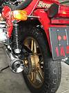 The 900 Sei developed 80 HP and features triple DellOrto carbs, OHC design, -speed transmission and a design still based largely on the Honda 500 four. Wheelbase is a trim 56” and the wet weight is listed at 549 lbs. Disc brakes are fitted to both of the gold finished Campagnolo rims. Final drive is by a unique, ong wearing duplex chain.