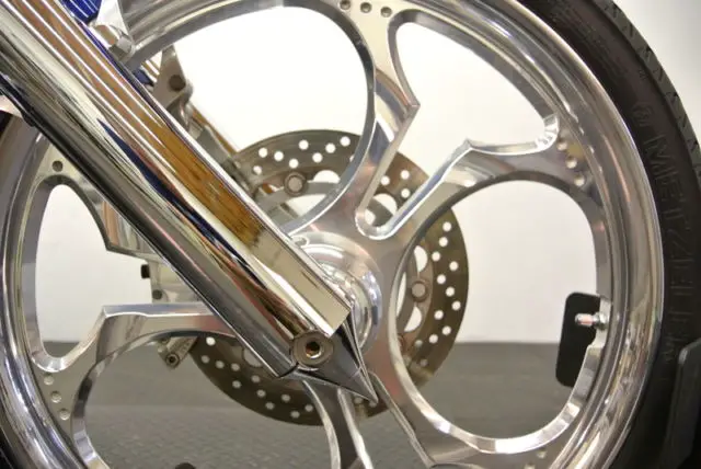 THERE ARE NO DENTS OR DINGS THAT I CAN FIND, OWEVER THERE IS A MINOR BLEMISH ON THE FRONT AND REAR FENDER. THE CHROME AND ALUMINUM ARE IN GOOD CONDITION. THE TIRES HAVE GOOD TREAD LEFT ON THEM, HE REAR TIRE IS A 300MM.