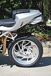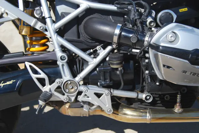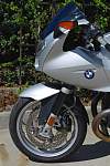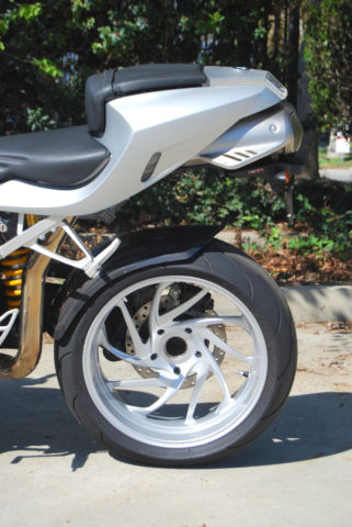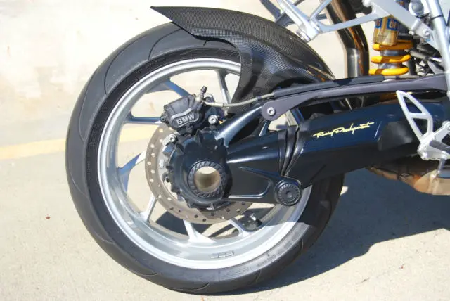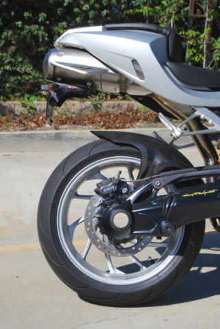 The bike was ordered with many options available from BMW, ncluding: Sport Suspension Ohlins®, $690), Front Shock ($965), Rear Shock ($1,705), Wide Rear Wheel 6.0 x 17 ($205), Tire Pressure Monitoring ($260), ABS, hich can be turned off ($925), eated Hand Grips ($235), On Board Computer ($275), oth tank bags, arge and small. In addition, he screen was replaced by a Puig tinted item and the levers replaced with Bestem adjustables, ut the original parts accompany the bike. A carbon fiber rear hugger was also installed with a fender eliminator kit to tidy the rear end.
