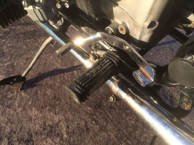 Previous owner was a long time owner and shared his stories of driving it from Iowa to California and up and down the cost from Mexico to California. He had a gigantic ugly fairing on it which I pulled and sorted out some of the old dodgy fairing wiring. Some where along the way one of the pipes got battery acid on it but not rusty.....the other looks like it was replaced and is near perfect. He added a strangeoil drain fitting that I would go back to stock on.You can find them on ebay for $20.00 or simply weld it closed. Also there is a heel shiftthat can beremoved if you don't like it. Kinda cool though. The front blinker lights are there but were removed for the fairing and the "dog ears" that hold them have the wiresin them but he shortened them . I am sure there is more but it is 40 years old so expect a bit of wear.