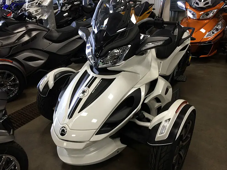 Manufacturer Can-Am Model Year 2014 Model Spyder?® ST-S SE5 MSRP  $22. 49. 00*  DIMENSIONS Length 105 in. (2. 67 mm) Height 52. 4 in. (1. 32 mm) Width 59. 3 in. (1. 06 mm) Weight 864 lbs. (392 kg) Ground Clearance 4. 3 in. (110 mm) Wheelbase 67. 5 in. (1. 14 mm) Seat Height 29 in. (737 mm) ENGINE Engine Rotax?® V-twin Horsepower 100 hp (74. 5 kW) @ 7. 00 rpm  Displacement 998 cc (60. 9 ci) Bore x Stroke 3. 82 x 2. 68 in. (97 x 68 mm)  Torque 80 ft. lbs. (108 Nm) @ 5. 00 rpm  Carburetion Electronic fuel injection and electronic throttle control Fuel Tank Capacity 6. 6 gal. (25 l)Reserve: 1 gal. (3. 8 l)  Cooling Liquid DRIVETRAIN Transmission 5-speed semi-automatic with reverse (SE5)  BRAKES/WHEELS/TIRES Brakes Foot-operated. hydraulic 3-wheel brakeFront: 270 mm discs with Brembo 4-piston fixed calipersRear: Single 270 mm disc with Brembo 1-piston floating caliperParking: Electro-mechanical Wheels Front: Machined Carbon Black Satin 6 twin-blade spoke. 15 x 5 in. (381 x 127 mm)Rear: Carbon Black. 15 x 7 in. (381 x 178 mm) Tires Front: 165/55 R15Rear: 225/50 R15 ELECTRICAL Lighting 2 halogen headlamps (60W)  Instrumentation Premium Color Digital Gauge: Digital speedometer. tachometer. odometer. trip and hour meters. gear position. temperature. engine lights. electronic fuel gauge. clock OPERATIONAL Capacity Maximum Vehicle Load: 440 lbs. (200 kg)Total Storage: 12 gal. (44 l)Towing: 400 lbs. (181 kg) Suspension Front: Double A-arm with anti-roll bar; gas-charged FOX PODIUM shocks; 5. 5 in. (142 mm) travelRear: Swing-arm; SACHS monoshock; 6 in. (152 mm) travel BODY Colors Steel Black Metallic. Pearl White. Circuit Yellow Metallic. CognacOn Jan-20-12 at 16:36:31 PST. seller added the following information: Shipping Price Estimator What is your Delivery Zipcode? powered by
