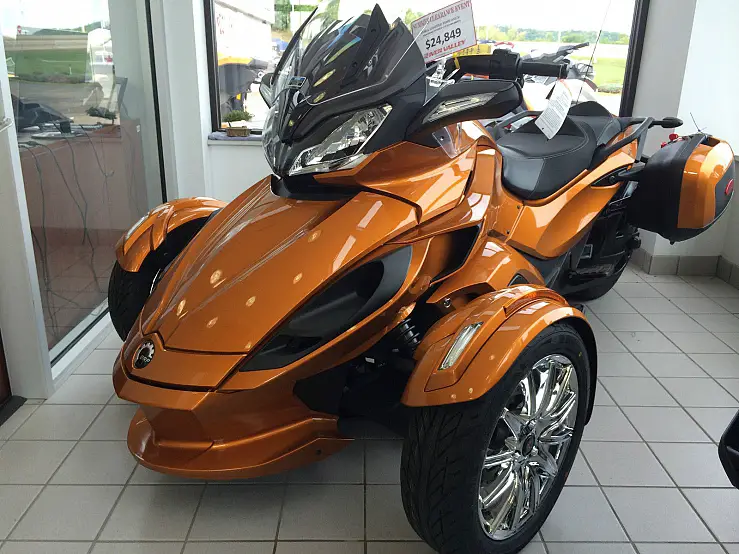 Manufacturer Can-Am Model Year 2014 Model Spyder?® ST Limited MSRP  $24. 49. 00*  DIMENSIONS Length 105 in. (2. 67 mm) Height 52. 4 in. (1. 32 mm) Width 59. 3 in. (1. 06 mm) Weight 864 lbs. (392 kg) Ground Clearance 4. 3 in. (110 mm) Wheelbase 67. 5 in. (1. 14 mm) Seat Height 29 in. (737 mm) ENGINE Engine Rotax?® V-twin Horsepower 100 hp (74. 5 kW) @ 7. 00 rpm  Displacement 998 cc (60. 9 ci) Bore x Stroke 3. 82 x 2. 68 in. (97 x 68 mm)  Torque 80 ft. lbs. (108 Nm) @ 5. 00 rpm  Carburetion Electronic fuel injection and electronic throttle control Fuel Tank Capacity 6. 6 gal. (25 l)Reserve: 1 gal. (3. 8 l)  Cooling Liquid DRIVETRAIN Transmission 5-speed semi-automatic with reverse (SE5)  BRAKES/WHEELS/TIRES Brakes Foot-operated. hydraulic 3-wheel brakeFront: 270 mm discs with Brembo 4-piston fixed calipersRear: Single 270 mm disc with Brembo 1-piston floating caliperParking: Electro-mechanical Wheels Front: 12-spoke chrome front rims. 15 x 5 in. (381 x 127 mm)Rear: 15 x 7 in. (381 x 178 mm) Tires Front: 165/55 R15Rear: 225/50 R15 ELECTRICAL Lighting 2 halogen headlamps (60W)  Instrumentation Premium Color Digital Gauge: Digital speedometer. tachometer. odometer. trip and hour meters. gear position. temperature. engine lights. electronic fuel gauge. clock OPERATIONAL Capacity Maximum Vehicle Load: 440 lbs. (200 kg)Storage: 12 gal. (44 l)Saddlebag Storage: 18 gal. (68 l)Towing: 400 lbs. (181 kg) Suspension Front: Double A-arm with anti-roll bar; gas-charged FOX PODIUM shocks; 5. 5 in. (142 mm) travelRear: Swing-arm; SACHS monoshock; 6 in. (152 mm) travel BODY Colors Black Currant. Silver Platinum Satin. CognacOn Jan-20-12 at 16:36:31 PST. seller added the following information: Shipping Price Estimator What is your Delivery Zipcode? powered by