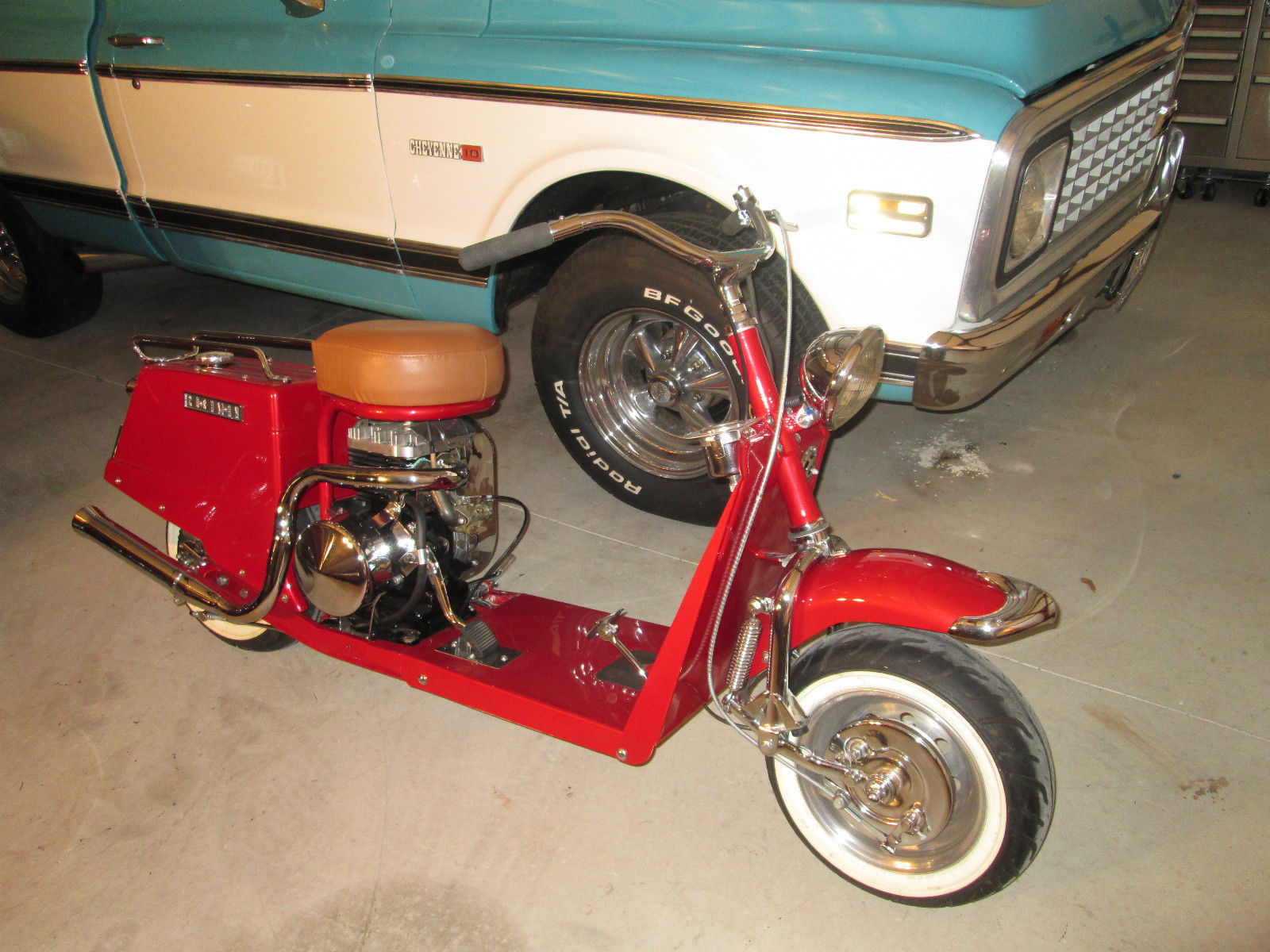 Up for auction next to the last of my Elderly Fathers Cushman collection. This is one of the best if not the best Cushman Highlander you will ever see absolutely no disappoints . It has a professionally built High Performance 8-HP engine fresh built. new billet performance machined head. HI. PO cam. large valves. enhanced piston . nbsp; everything in the flywheel new. clutch rebuilt. engine cost over $3800. 00. custom chrome exhaust pipe. new brakes front and rear. hubs rebuilt. 10 inch polished aluminum wheels with speed rated tires. beautiful 3 stage PPG paint. custom seat. chrome front forks. handle bars. brake covers. brake pedal. kick start lever. chain adjusters. speedometer. the engine is chromed. This is a beautiful Cushman Highlander with a good clear Oklahoma Title. This Highlander has never been ridden since it was restored. no gas was put in the tank. the engine was started on a engine stand with a quart gas tank for 15 minutes. the engine oil was drained and Scooter was placed on display in a climate controlled game room. This Highlander can be inspected prior to auction end no disappointments can easily be shown in Cushman Show and Win. This Cushman Highlander is sold where is how is no warranty. winning bidder is responsible for obtaining and paying for shipping. a $500. 00 deposit is required at end of auction. the remaining balance is due within 72 hours of auction end by means of Bank Wire to Wire transfer.