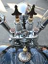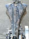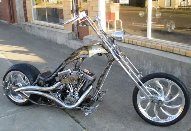 Oil tank and gas tank are both custom made. Engine is a 113 ci Ultima comes with Mikuni carburetor. Transmission is also Ultima a left side drive 6 speed with open belt primary. Bike has plenty of cool features including matching forward controls along with custom hand controls and grips custom designed and chromed ape hangers. chrome kick stand chrome starter custom motor mount and key switch chrome exhaust with brass and stainless hand made heat shields custom camo seat with deer skull center design chrome headlight and axle mounted tail light and license plate bracket with LED brake light. Chrome springer front end with hand made brass and stainless accents with custom pierced rockers. Matched chromed front brake rotor and caliper. Real wheel has a sprockster set-up (sprocket is the brake rotor). Gas tank also has custom made brass and stainless full accents on the front side of tank - also comes with a custom made pop-up gas cap (one-off). The whole bike (frame gas tank oil tank) are all Realtree camo hydro-dipped under 3 coats of urethane clear. There are a few more really cool accents including spiked end caps for the frame at the rear wheel (see pix). Also brass hand hammered axle caps and two brass accents on the upper motor mount.