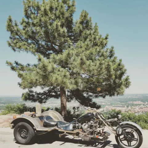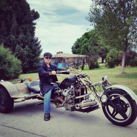 Jenky is a Custom built Mutant Vehicle, at Rod Trike that started life as a Honda 1980 CX500 then jetted and combined with a 1963 dodge dart rear differential. throughout her construction pretty much every major auto / motorcycle manufacturer is represented. Ford, hevy, oyota, ubaru, aguar, amaha, awasaki, MW, arley Davidson, onda, yundai... etc.