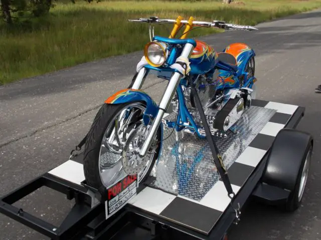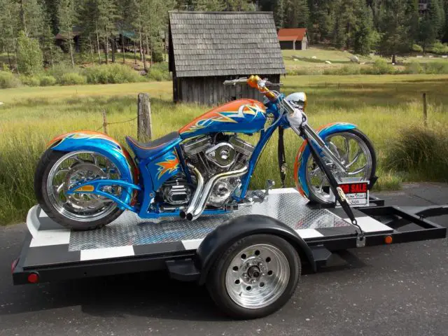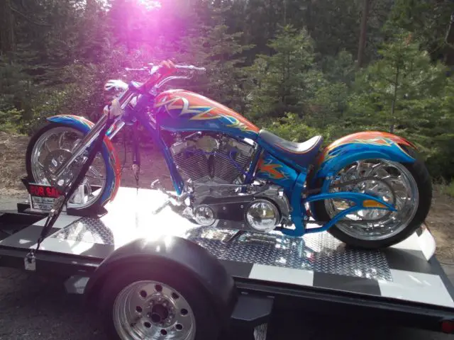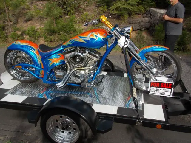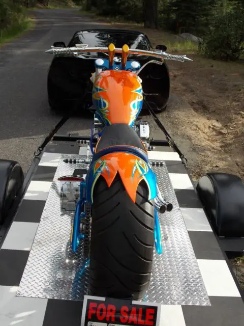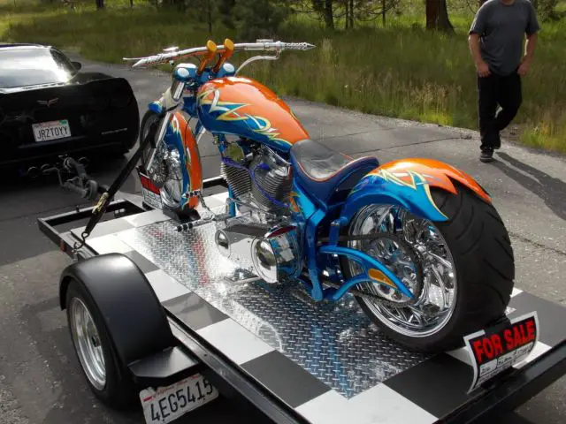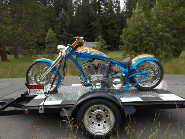 I purchased this complete kit in bare metal and then procedded to upgrade . S&S 124, aker 6 spee, pyke inverted front end , olorado digital speed/gauge kit ( not installe, ut comes new in pkg w/bike)spyke hi torqe starte, M calipers lots of chrome and anodized parts . The bike only has 50 miles at most on it . It runs beautifully . I must say you must understand a bike like this to ride it . It is very low and does not like cornering . Sounds off the hook !!! Very powerful !! I have a file full of reciepts totalling -$40000 + . This bike is not for the weak of back or loss of grip .... hold on like hell !!! Draws big crowd where I have taken it . I have turns signals and mirrors brand new in box to go with it . I can put bike on dyno and video going thru the gears for any serious buyers across state . Paint job cost $5,00, s true candy with real 24K. gold overlay and real silver overlay... old school flash . I am open to possible trades and willing to negotiate price . I am 51 and this is too much bike for me ....Due to personal financial crisis I am reducing asking price to 20,000 to sell quicker and this price is firm