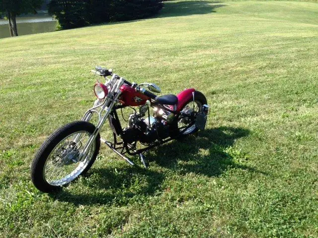 This is a custom built bike. has a 125 cc motor top speed 70 four speed suicide shifter built after the old styled bikes. It has show room paint candy apple red seven coats and clear.