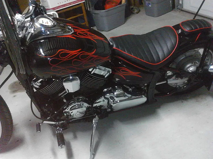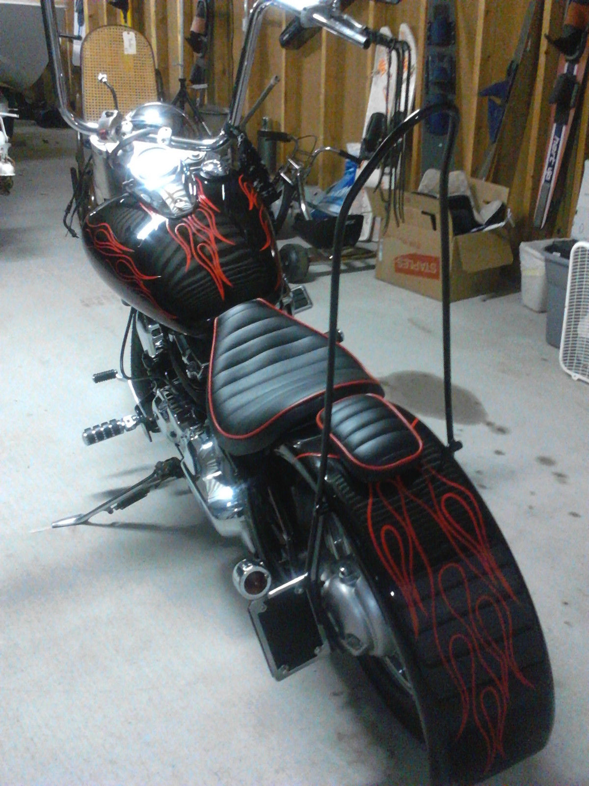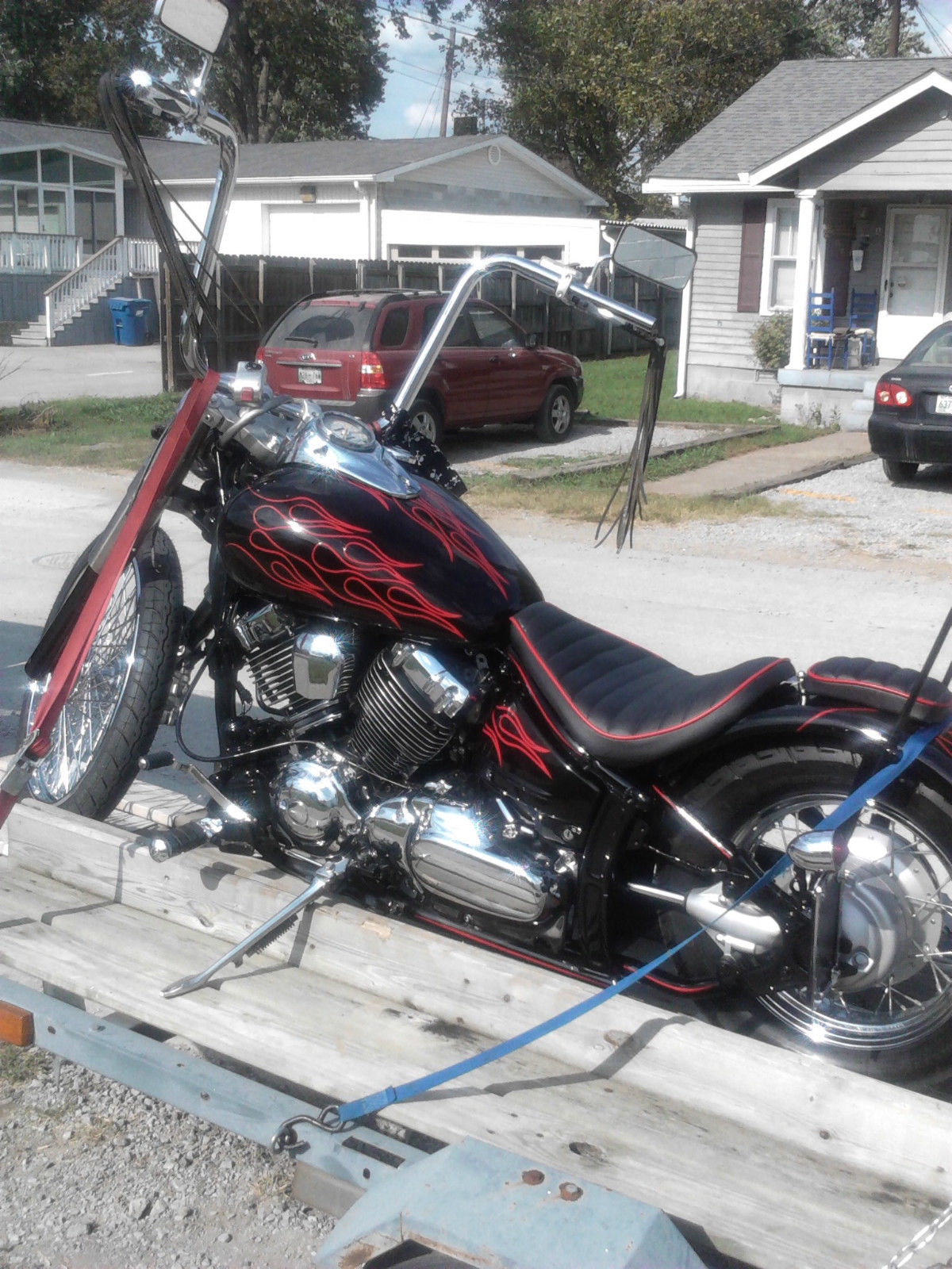This bike started out as a 2003 V-STAR 650. I took it in my shop with 3900 original miles before the rebuild. Brand new Harley 21 inch 100 fat spoke front wheel. Brand new front and rear tires. Bike was lowered 3 inches in the rear. and raised 3 inches in the front. The tank has been professionally cleaned and lined. Carbs rebuilt and rejetted. New high performance clutch. Custom chrome plated Harley front rotor. Frame and tins black base coat and clear coat. Hand painted pin striped flames throughout. frame also hand painted pin stripes. Custom Harley K& N air intake. All engine covers METAL not plastic. Engine fully detailed. polished and painted. Motor runs great. Hand made custom 2 1/2 inch long shotgun exhaust. Freshly chrome plated. is included just not shown in pictures. Custom made tuck and roll seat. with matching pillion seat. It is suction cupped on. the fender. Hand made 24 inch (bent tip) sissy bar. New battery. 16 inch gorilla ape hangers. All new Harley diamond grips and pegs. Early Harley mirrors. 7 inch Tri-bar headlight. The only thing the bike needs to be finished is the extended throttle and clutch cable. There has been over $6000 invested I am asking $3900 or BEST REASONABLE offer. This bike shows GREAT. It is being sold with all mechanic lien holder papers needed to be titled in any state. Please contact me if you have any questions. I am interested in any EARLY model Cadillac car or Sportster for possible trades.