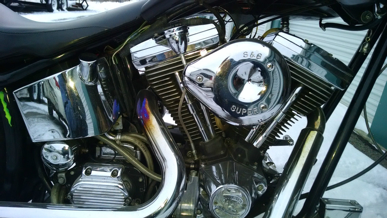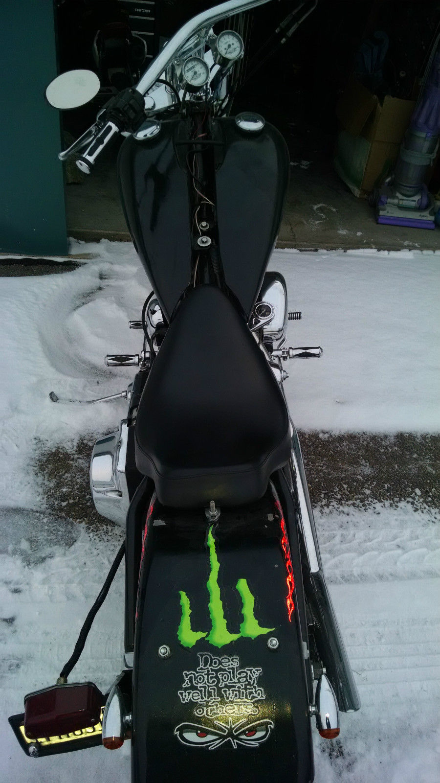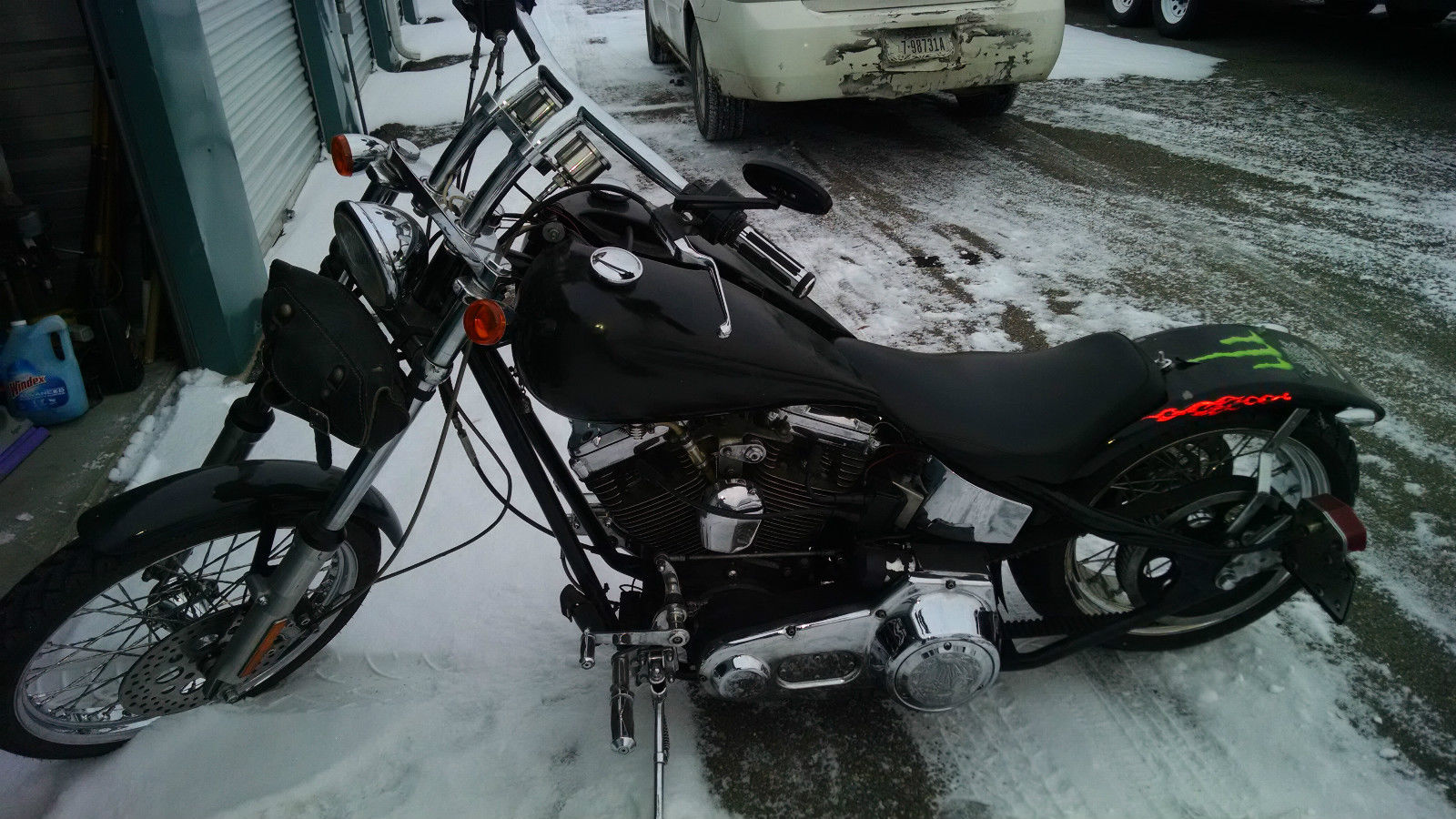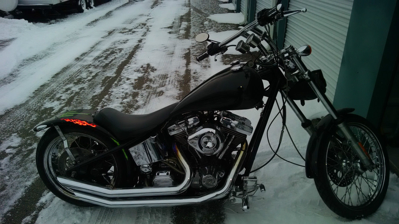 first off I built the bike back in 06 and got it registered then it has a clear tittle owned bye me the engine transmission and primary came out of a 87 Harley softail I had and built my rigid but times are tough and don't have the money or time to give her a facelift paint is rattle caned engine is a stock 80 incher except I put screaming eagle stage 2 cams in her she has a S&S super e carb on her I also replaced gasket between the cases and barrels also put S&S high flow oil pump trans is stock 5speed as for the frame I got it out of new jersy don't remember the name of company its been powder coated black rear tire is a 18x5. 5 rim 180 tire front is a twisted spoke 21" seat is from corbin this is a true garage built bike any other questions just ask and ill respond thanks for looking also bike was last regisetered in california
