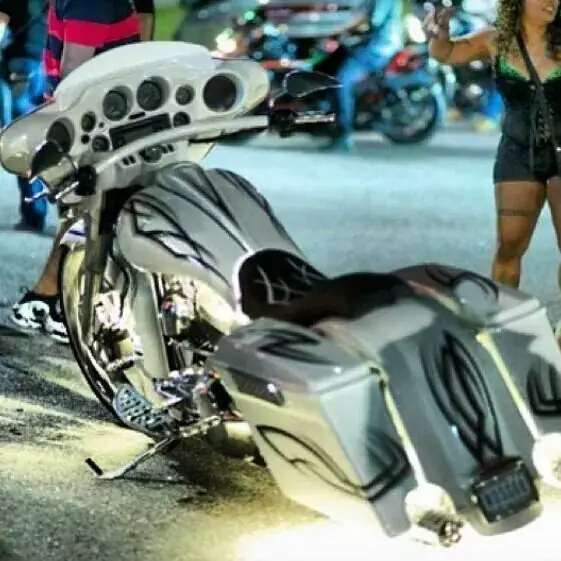 This scoot is flawless. I bought it two years ago from Miami Choppers who built it and the spared nothing on it. It is smooth riding over 100 mph hour it has a raked neck to fit the 23" and is ready to go bigger with trees only if that's what your into. It's won numerous awards at shows. I'm ready to build a new one I'm very into change but I've got to let my baby go first. The paint is perfect and flows through the bike great with a matching custom ostrich leather seat. under body lighting that is real nice and clean looking. Rotors match rims. Fender is a true stretched replacement fender not a lay-over. all the hard ware is there to mount a touring pack if you want. Bags are true stretch bags not extensions. and they hold allot. I've road this bike from Michigan to New York and back with no issues. It has just over 12. 00 miles on it. All service has been done at the dealership as scheduled. It has a 96 cubic inch motor and a six speed transmission. DON'T MISS OUT!