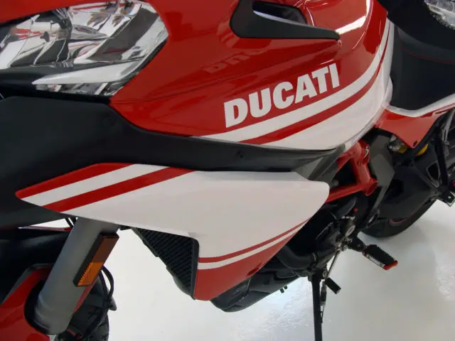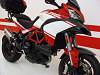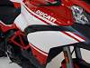 The Multistrada 1200 S Pikes Peak livery of Ducati Corse red with GP-like white stripe contrasts stylishly with the passenger foot-peg hangers and engine guard anodised in black and sporty red pin-striping applied to the stunning new 1199 S Panigale-style triple 3-spoke wheels, orged and machined by Marchesini.