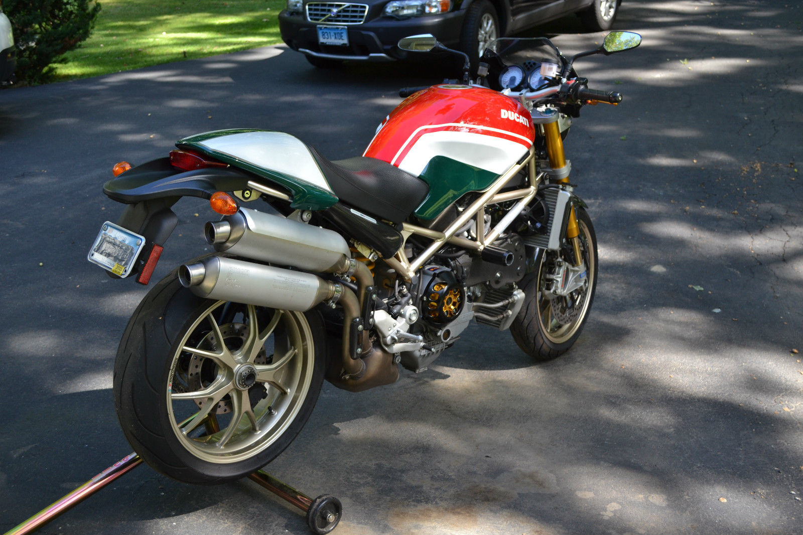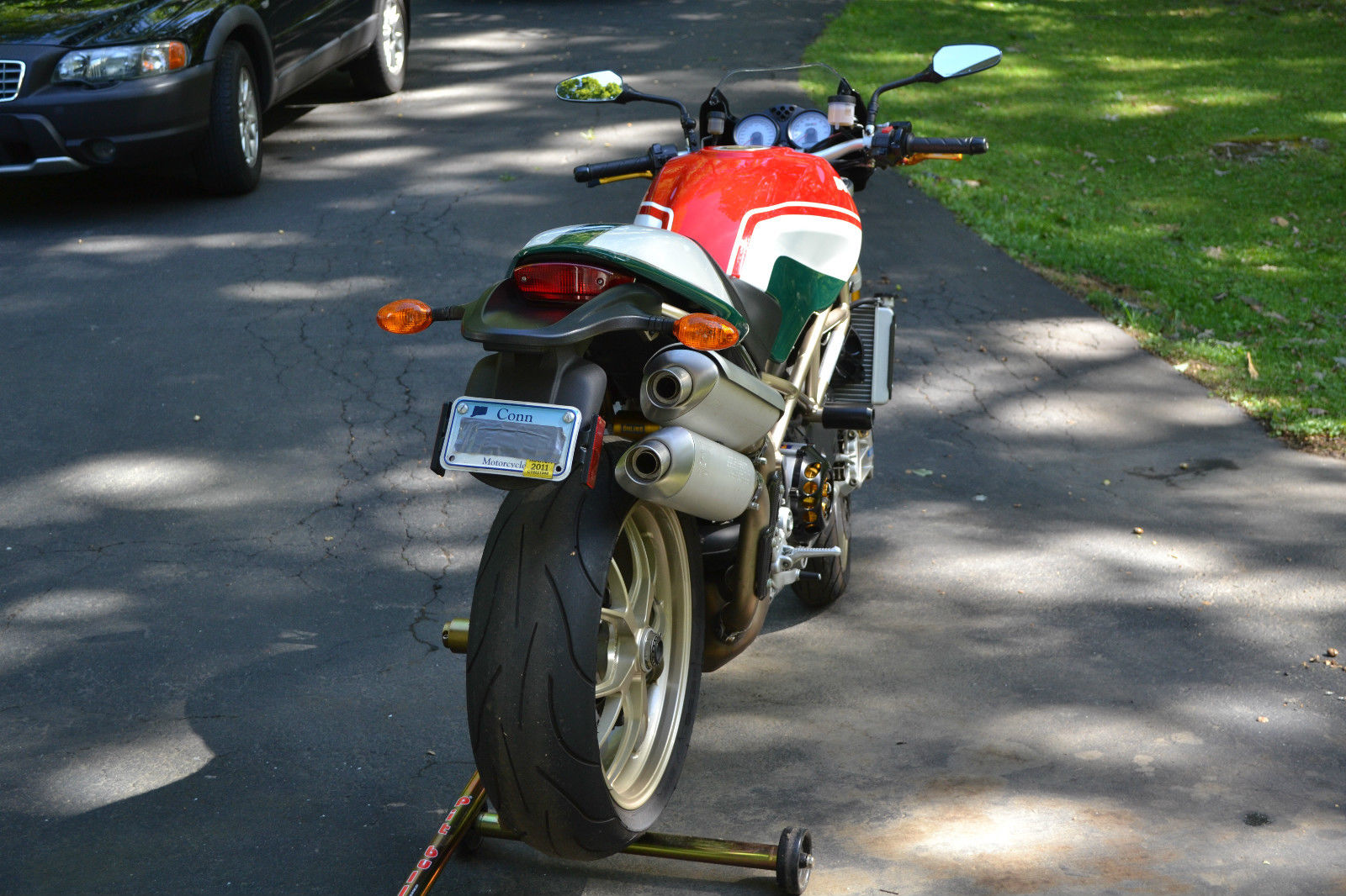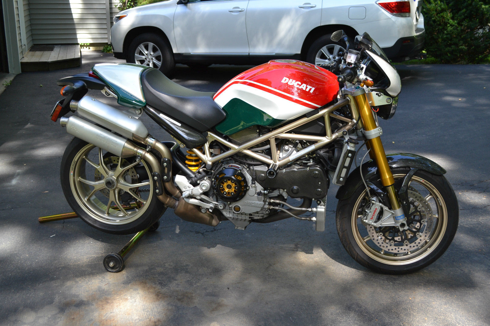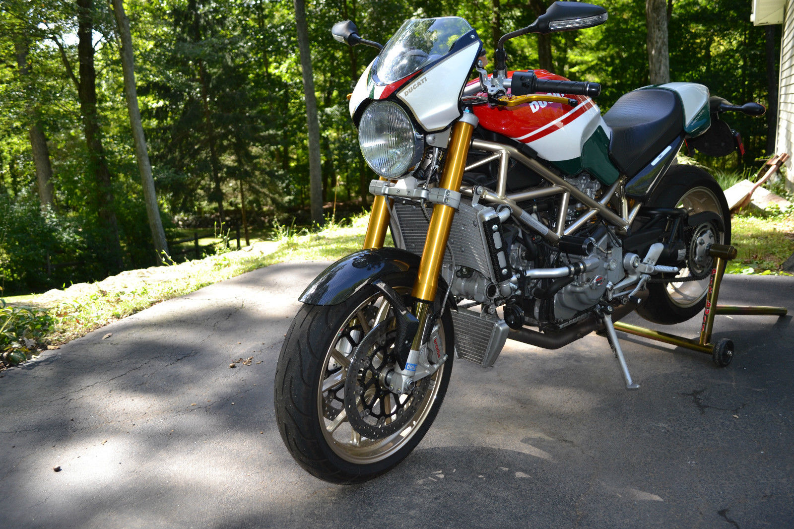 2008 S4RS Tri color Monster- Excellent condition all around. everything works with no issues and bike performs flawlessly. The bike was purchased 4 years ago from a dealer in Mass. with 3000 miles on the odo and has been ridden an additional 3200 miles over the 4 years I have owned the bike. There are 2 small paint chip's that can be seen in the photo's- 1 on the mirror mounting post and the left side of the radiator- otherwise mint condition. The original tires still have good tread as expected for mileage shown. The bike has never seen rain. has never been raced. never dropped or abused in any way. Basically stock with the exception of the clutch cover/plate assembly. clutch and brake lever handles. I put a pair of stock mufflers on recently but have the Termi shorty the bike came with when I purchased the bike- mildly LOUD!- and can be switched out in about 20'. The red programming key and 2 black keys. passenger peg's. owners manual and tool kit are all there. I also have a Pit Bull stand that will go with the bike. The bike is for sale as is and does not have a warranty- sold as is. where is. All shipping costs are responsibility of winning bidder.