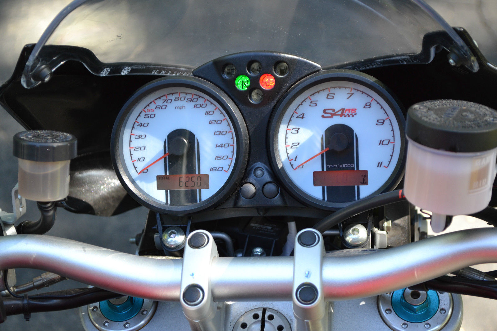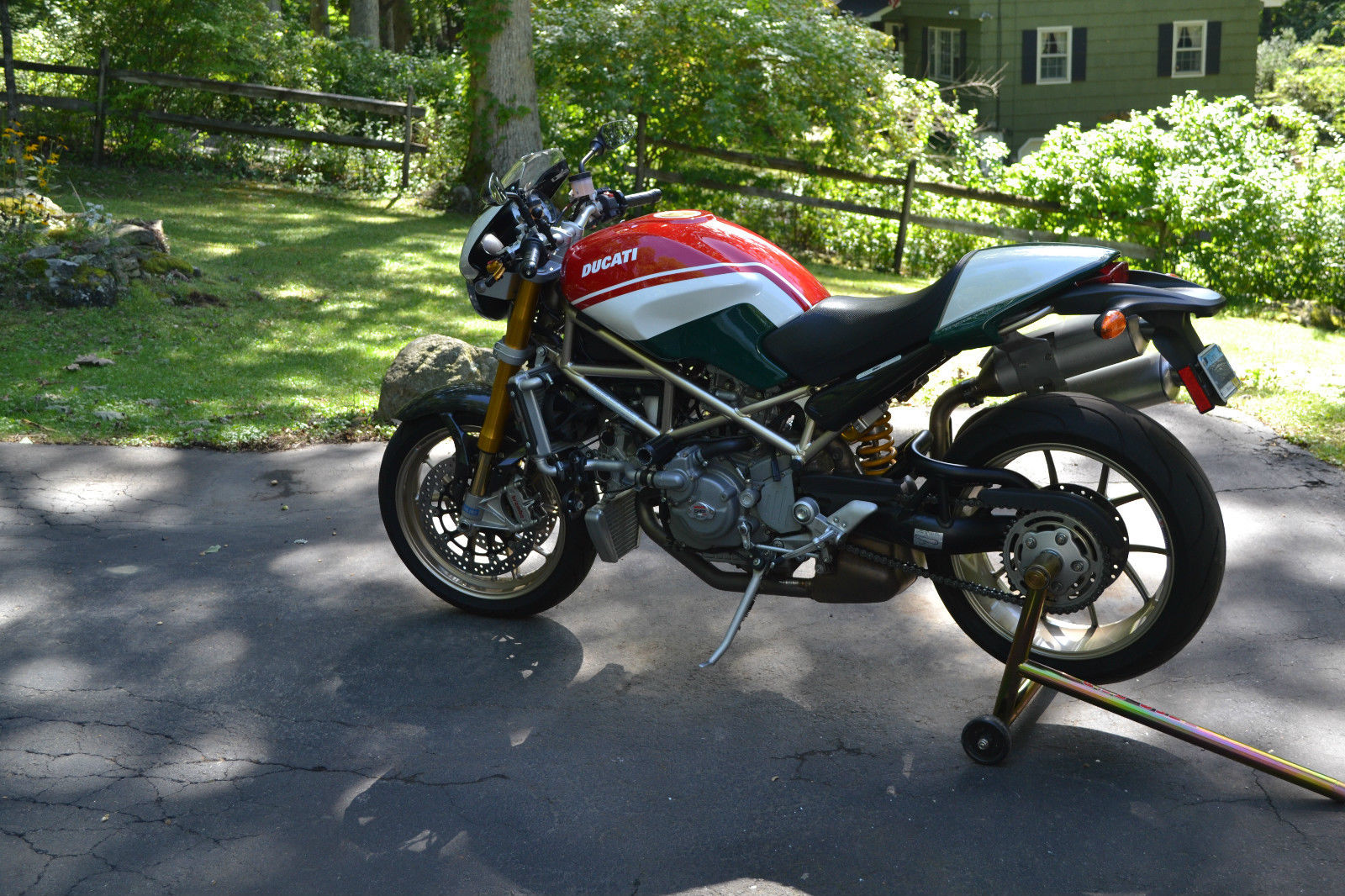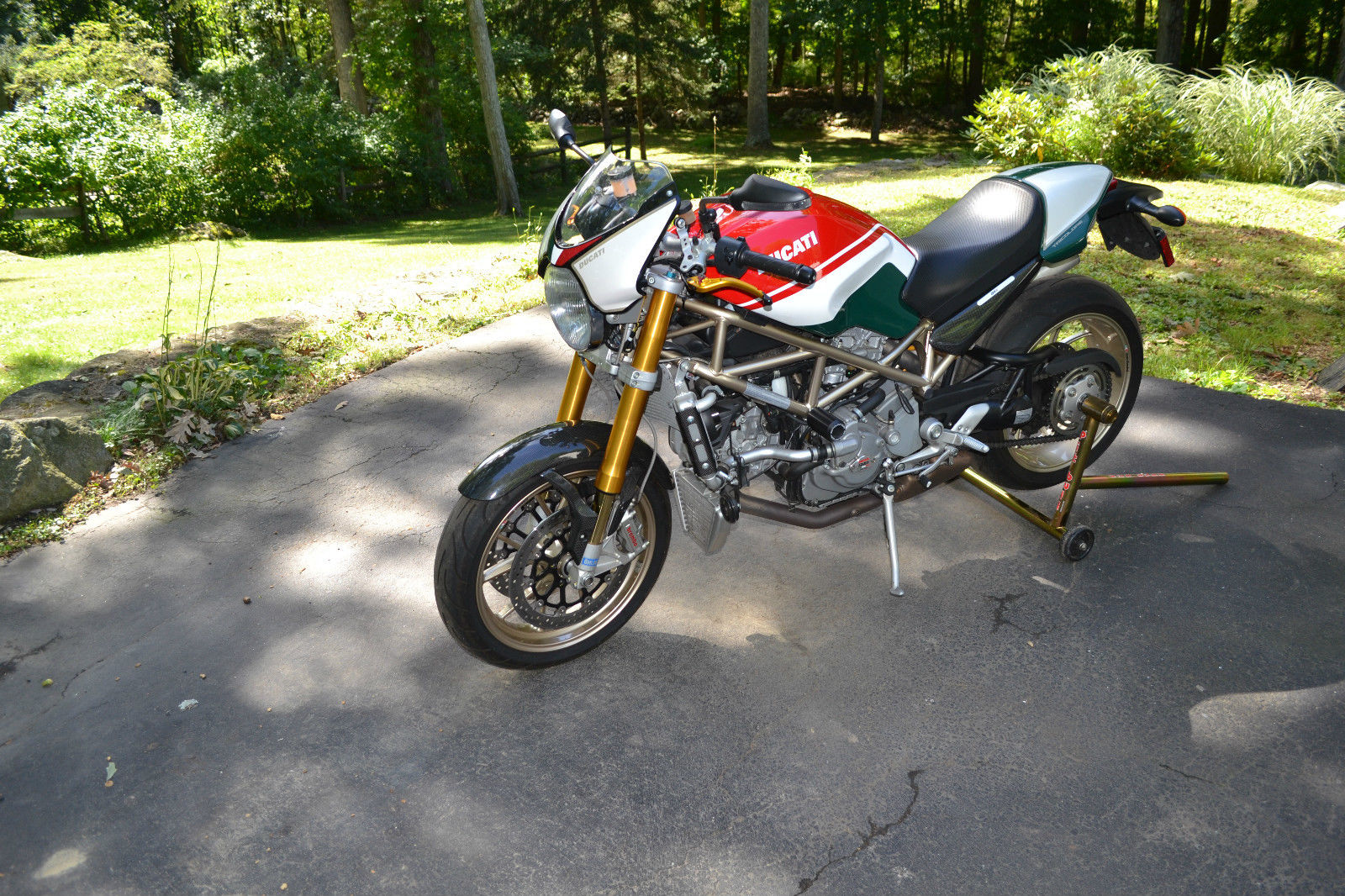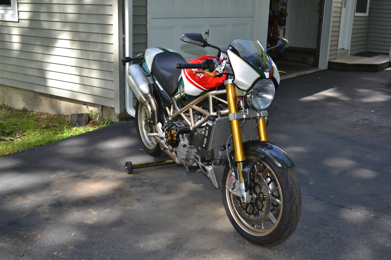 2008 S4RS Tri color Monster- Excellent condition all around. everything works with no issues and bike performs flawlessly. The bike was purchased 4 years ago from a dealer in Mass. with 3000 miles on the odo and has been ridden an additional 3200 miles over the 4 years I have owned the bike. There are 2 small paint chip's that can be seen in the photo's- 1 on the mirror mounting post and the left side of the radiator- otherwise mint condition. The original tires still have good tread as expected for mileage shown. The bike has never seen rain. has never been raced. never dropped or abused in any way. Basically stock with the exception of the clutch cover/plate assembly. clutch and brake lever handles. I put a pair of stock mufflers on recently but have the Termi shorty the bike came with when I purchased the bike- mildly LOUD!- and can be switched out in about 20'. The red programming key and 2 black keys. passenger peg's. owners manual and tool kit are all there. I also have a Pit Bull stand that will go with the bike. The bike is for sale as is and does not have a warranty- sold as is. where is. All shipping costs are responsibility of winning bidder.