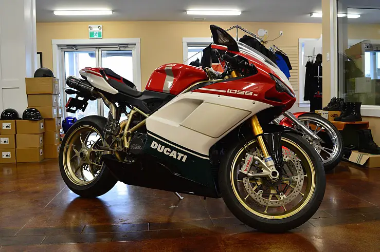 2007 1098S Tricolore. This bike has never seen the road. with only 7km's on the clock (Those KM's were on the bike when bought new). Limited production with just 1013 manufactured & sold world wide. Classic Ducati with gold trellis frame. red. white. green & gold color scheme with beautiful gold Marchesini wheels. Custom Moto GP look with black powder coated rear swing arm. Aftermarket rear sets (Woodcraft). shift & brake levers (CRG). stock gas cap with push button release. rear brake rotor (SK2). nbsp;triple tree (Corse Dynamics). Carbon Fibre Heel Guards (CM Composit). Samco Silicon cooling hose kit and clutch cover make the look off the chart. If you've never heard one. it's almost like starting a V-8 muscle car. the sound is incredible. On consignment at Powertrend Cycles at 1093 St. Margarets Bay Road. Nova Scotia. Canada by a private collector. Will supply shipping crate. purchaser to arrange shipping. Very low reserve for this rare collectors item with no mileage. Ask for Sean. (902) 461-8122 Engine: Engine Type Longitudinal Twin Cylinders 2 Engine Stroke 4-Stroke Cooling Liquid Valves 8 Valves Per Cylinder 4 Valve Configuration DOHC Compression Ratio 12. 5:1 Starter Electric Fuel Requirements Premium Fuel Type Gas Transmission: Transmission Type Manual Number Of Speeds 6 Primary Drive (Rear Wheel) Chain Wheels & Tires: Front Tire (Full Spec) 120/70 ZR17 Rear Tire (Full Spec) 190/55 ZR17 Brakes: Front Brake Type Dual Disc Rear Brake Type Disc Technical Specifications: Wheelbase (in/mm) 56. 3 / 1430 Fuel Capacity (gal/l) 4. 1 / 15. 5