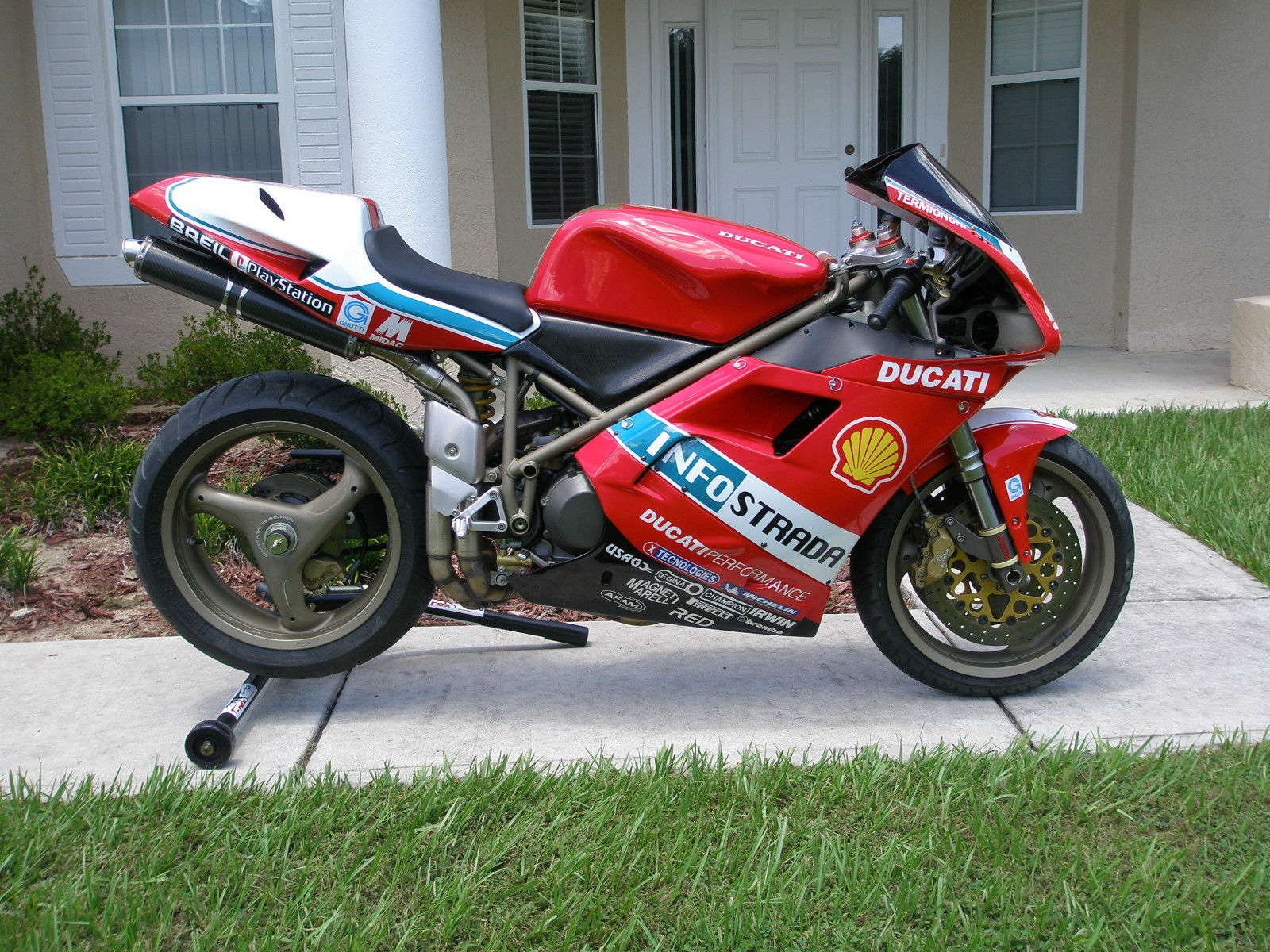 This Ducati 748 has been my spare bike for track days and hardly used on the track. I am the second owner and the first owner brought the bike over with him from Germany. The bike is fully road worthy and is still registered. tagged and titled. The original OEM fairing will be included in the sale along with a brand new unused body work the same as in the pictures so in total there is three body work kits included with this bike. The bike runs just as you would expect a Ducati to perform. it is not as fast as today's 848's and 1198's but considering its age the bike is a real classic and becoming a very sought after motorcycle. Please give me a call on 352 489 6013 if you need and more information or want to come over and view the bike. Also included in the sale are a pair of highly polished wheels for this bike.