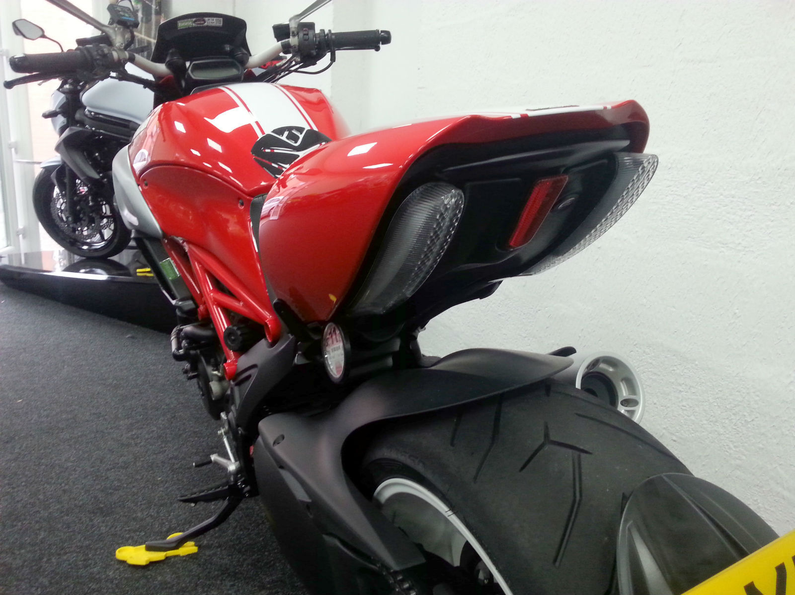 Ducati Diavel StripeThis bike has had 1 careful owner. Was supplied and maintained by ourselves and is immaculate throughout. Remainder of manufacturers warranty until June 2015. We are an official Ducati and Kawasaki UK dealer and the bike is supplied with the usual dealer facilities. Part exchange welcome. Finance available upon request but is subject to status - please call for details and quoteNB you must sign all documents at our store in person and original driving licence both parts in current address must be provided. (other forms of ID may be requested)£500 deposit will secure the bike and will be removed from sale. unless financing the vehicle please call for detailsCredit Cards Accepted with 2% handling fee for transactions over £500. Personal Cheques must clear before bike can be collectedDelivery available upon request please call or mail with your address for a quote
