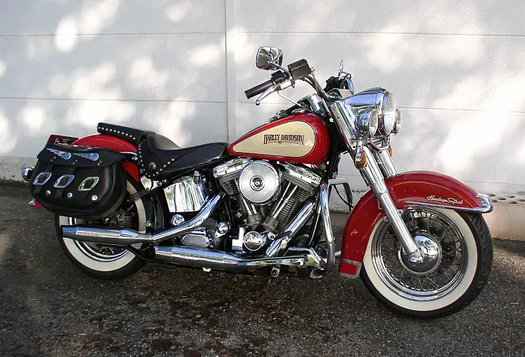 This Harley Davidson Heritage Softail is in very nice. well cared for condition. It has the "classic trim" and is dressed like a 1960s Electra-Glide; vintage look with lots of chrome. It is a great running bike. and has a new battery. It comes with the original rear seat. original large leather Harley Davidson saddlebags. original windshield and factory mufflers. (In the photograph with the tent you can see the large saddlebags and original rear seat. ) Motorcycle has circa 26. 00 original miles on it. Questions: 760-470-2051.