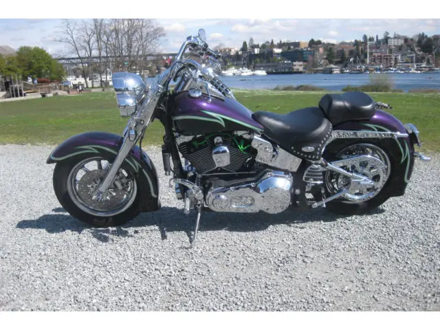 Additional work/Accessories – Thunderheader exhaust. Screaming Eagle clutch and air cleaner. H-D 9-spoke solid wheels front and rear. Arlen Ness Taildragger front and rear fenders. Custom Chrome stretched 5-gallon tank. Fatboy bars. Accutronics forward controls. Audio by Jensen Marine 200 watt w/CD and iPod input with remote. Â Â Many Kuryakyn trim pieces.Spares – Complete extra top end for motor. stock softail shocks and mounting gear with only 8 original miles