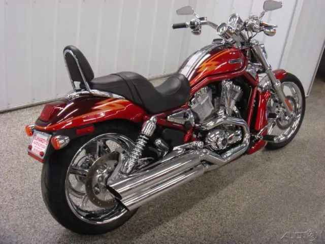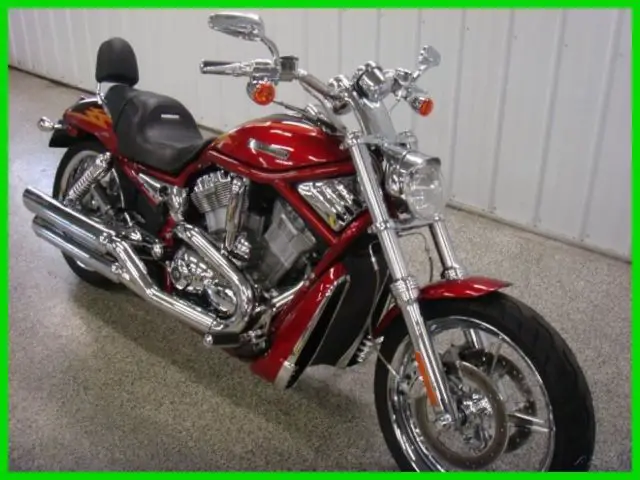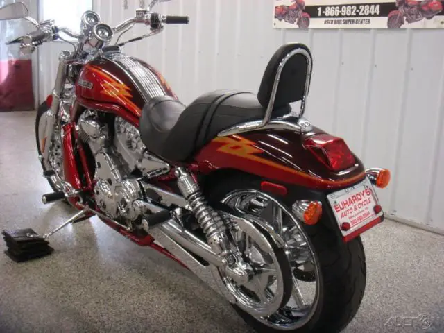 Listing by Auction123. com copyright Auction123. Inc. Euhardy’s Auto & Cycle - N4796 County Road B New London. WI 54961 - 1-866-982-284405 Harley-Davidson® VRSC™ A V-Rod®Priced to Sell Fast!!! Click here for an XL view of the above Image   PrevNext  1 2 3 4 5 6 7 8 9 10 11 12 13 14 15 16 17 18 19 20 21 22 23 24 25 26 27 28 29 30 31 32 33 34 35 36 37 38 DescriptionBasic InformationType: StandardMileage: 9174Title: Rebuilt. Rebuildable & ReconstructedColor: CHERY REDCondition: UsedStock Number: CSE2562Trim: A V-Rod®Model: VRSC™Make: Harley-Davidson®Year: 2005DrivetrainNumber Of Speeds: 5Primary Drive (Rear Wheel): BeltTransmission: ManualPrimary Drive (Engine / Transmission): GearSafetyHeadlightFuel Level WarningRearview MirrorsTemperature WarningOther InformationDetachable Passenger SeatLockable StorageRadiator CoverWarrantyExisting Warranty: NoChassis & SuspensionFrame: AluminumFront Suspension Size (in): 1. 9Front Suspension Size (mm): 49Front Suspension Type: Telescopic ForkFront Travel (in): 3. 9Front Travel (mm): 100Number Rear Shock Absorbers: 2Rear Suspension Material: Aluminum / SteelRear Suspension Type: Twin Sided Swing ArmRear Travel (in): 2. 4Rear Travel (mm): 60ComfortAdjustable HandlebarsAlarm SystemDigital InstrumentationTrip OdometerEngineBore (in): 3. 94Bore (mm): 100Carburetion Type: Fuel InjectedCompression Ratio: 11. 3:1Cooling System: LiquidCylinders: 2Engine Brand Name: RevolutionEngine Disp. to Weight (cc): 1. 9Engine Size (cc): 1250Engine Size (ci): 69Engine Stroke: 4-StrokeEngine Type: V TwinFuel Capacity (gal): 3. 7Fuel InjectorFuel Requirements: PremiumFuel Type: GasHorsepower: 115Horsepower (kW): 85. 8Horsepower RPM: 8500Starter: ElectricStroke (in): 2. 84Stroke (mm): 72Torque (Ft Lbs): 74Torque (Nm): 100. 3Torque RPM: 7000US Miles Per Gallon (City): 37US Miles Per Gallon (Hwy): 47Valve Configuration: DOHCValves: 8Valves Per Cylinder: 4BrakesFront Brake: Dual DiscFront Brake Diameter (in): 11. 5Front Brake Diameter (mm): 292. 1Rear Brake: DiscRear Brake Diameter (in): 11. 5Rear Brake Diameter (mm): 292. 1SpecificationsBody Material: AluminumDry Weight (kg): 270. 3Dry Weight (lbs): 596Front Tire (Full Spec): Dunlop 120/70 ZR19 60WFront Tire (Inches): 19Front Tire Aspect Ratio: 70Front Tire Speed Rating: ZFront Tire Width: 120Fuel Capacity (liters): 14Ground Clearance (in): 5. 6Ground Clearance (mm): 142. 2Length (inches): 93Length (mm): 2377. 4Rear Tire (Full Spec): Dunlop 180/55 ZR18 74WRear Tire (Inches): 18Rear Tire Aspect Ratio: 55Rear Tire Speed Rating: ZRear Tire Width: 180Seat Height (inches): 26Wheelbase (in): 67. 5Wheelbase (mm): 1714. 5Wheels Composition: AluminumSpeedometerTachometer ContactEuhardy’s Auto & CycleN4796 County Road BNew London. Wisconsin 54961 Ask for: Rob Euhardy TOLL FREE: 1-866-982-2844 MAIN: 920-982-2844Email: Email SellerAboutÂ