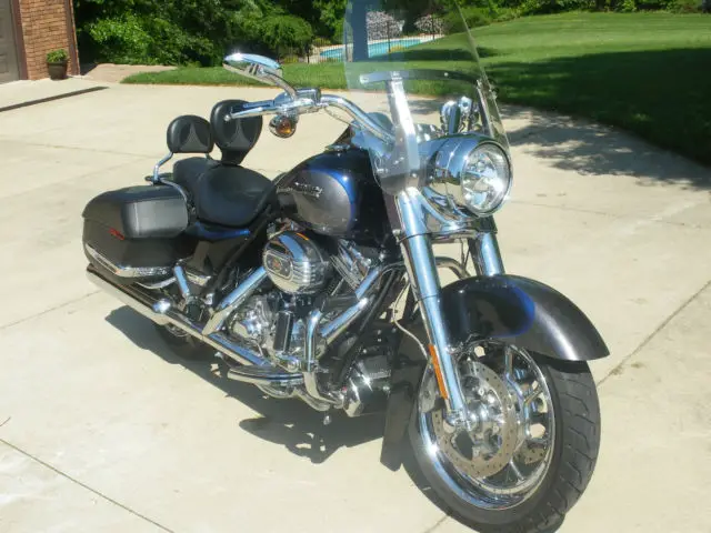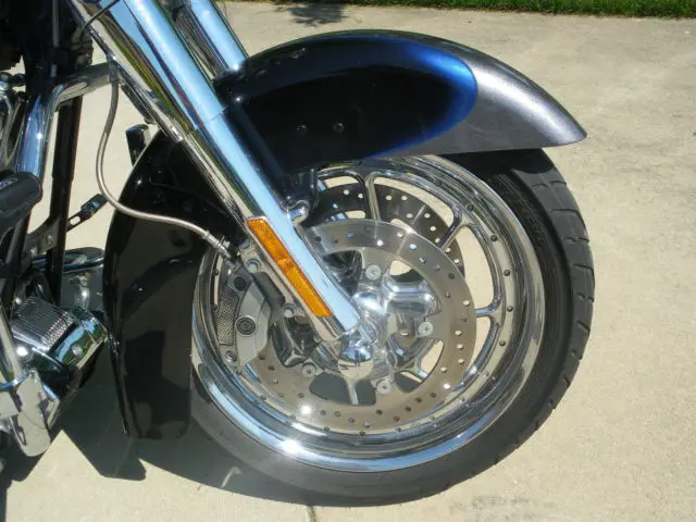 FLHRSE4 Screamin' Eagle Road King features: Twin Cam 110 cubic inch (1800cc) Engine with new Granite and Chrome finish 6-speed Cruise Drive transmission New Anti-lock Braking System (ABS) New front and rear brakes New six-gallon fuel tank New custom console New custom handlebar riser cover with indicator lights New design for custom leather seat. backrests and saddlebags Adjustable. detachable rider backrest Detachable passenger backrest New custom mirrors New Paint: Twilight Blue and Candy Cobalt with Ghost Flame graphics Black Diamond and Silver Dust with Ghost Flame graphics 18-inch x 3. 5-inch Chrome. Road Winder Forged Aluminum front wheel 17-inch x 4. 5-inch Chrome. Road Winder Forged Aluminum rear wheel Radial 130 mm x 18-inch front tire and 170 mm x 17-inch rear tire Wide rear fender Exclusive Tombstone tail light assembly and matching chrome hoop Color matched frames Color matched wide swing arm Custom leather saddlebags with chrome trim strips and custom leather inserts Spun aluminum metal-faced combination speedometer and tachometer with backlighting "Ironside" Collection: Chrome and rubber hand grips Rider foot board inserts Passenger footpegs Brake pedal pad Shifter pegs Side cover trim strips Screamin' Eagle SYN3 synthetic lubricant Black high-torque 1. 4 kW starter High-performance clutch with hydraulic actuation Cruise control Custom oil cooler with chrome cover Chrome voltage regulator Chrome timer cover with trim ring Chrome derby cover with trim ring Stratum Collection chrome billet timer Stratum derby cover with color-filled script Ribbed air cleaner cover with color-matched insert Silver front brake caliper with CVO insert Chrome front axle covers Chrome fork sliders and chrome upper fork covers Chrome lower triple tree cover Profile low rear suspension Chrome debris deflector Smoked turn signal lenses with amber bulbs Dark tinted. detachable mini-wind deflector Chrome switch housings and hand levers Clear-coated. braided stainless steel front brake and clutch lines Chrome extended-reach billet brake lever Chrome billet heel/toe shift levers Polished stainless steel hex shift linkage Chrome passenger footpeg supports Chrome valve stem caps Chrome front wheel bearing spacers Chrome four-inch Touring mufflers with chrome billet end caps Chrome Touring muffler shields Bullet-style rear turn signals mounted on chrome narrow turn signal bar Carryout saddlebag liners Harley-Davidson Smart Security System with Smart Siren Indoor storage cover with embroidered CVO logo Commemorative CVO ignition key with box Extra Windshield Hiway Foot Pegs