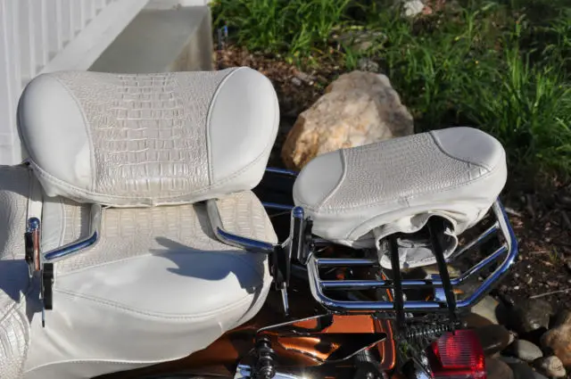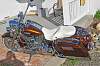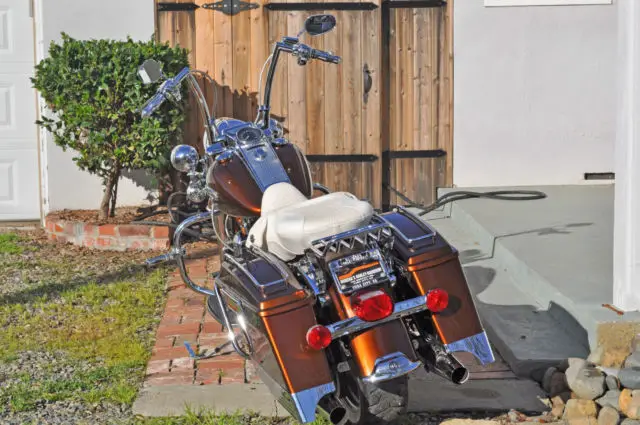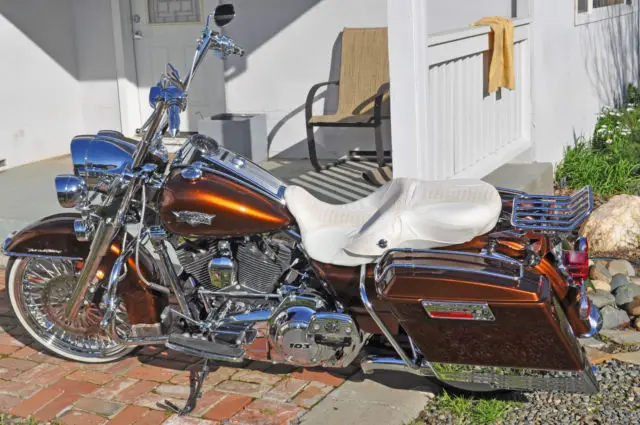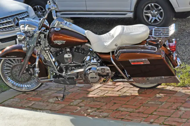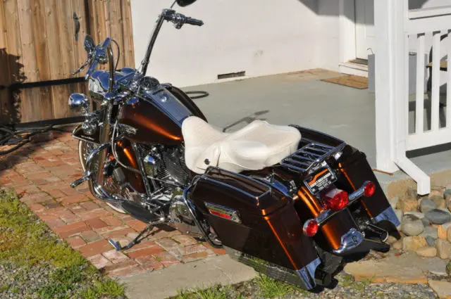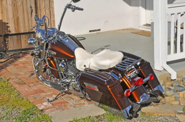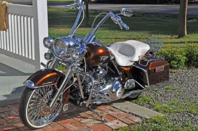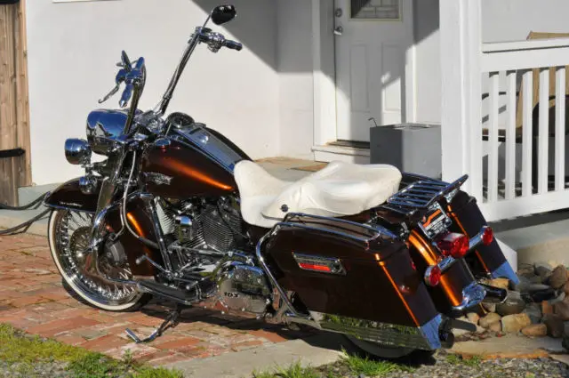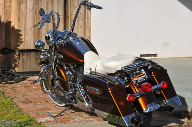 CLEAN. CLEAN. Garage kept. pampered motorcycle. To much to list 19inch Meat hook handle bars with chrome cables cost1500 dollars! 3500 dollar custom candy paint from Deano's custom painting in Arizona. This paint looks root beer candy when out of direct sun light; however. when in the sun hits it directly it appears dark candy orange! 2000 dollars for the 21 inch chrome front rim installed! 1000 dollars for the custom seat! Hard bags have 6x9 cut outs already for speakers! Chrome front lower forks 1500 dollars. 1500 dollar Thunder Header dual exhaust LOUD" Completely Chromed out motor! I have over 30. 00 dollars invested in this bike hands down! Low mileage on this bike well worth buying!