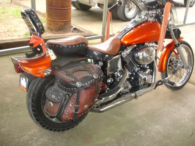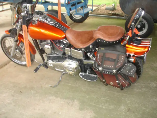 2004 Harley Davidson Dyna Wide Glyde. Excellent condition always kept indoors. Custom paint by a Cadilac dealership candy tangerine. Custome made saddle bags from a Texas saddlery. Lots of chrome parts. Screaming Eagle exhaust. Custom mustang seats covered with genuine cow hide. This is a great bike with no issues.