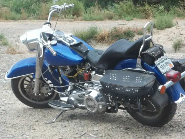 1980 80 cubic in shovel head. Viper blue. ustom leather quick detach bags. ustom touring seat. Comes with a slew of used and new parts. windshields. ighway bars. ront spot/foglamps with tool bag. Progressive suspension airshocks. -ring chain. rimo belt drive. All new cables. ew wheel bearings. ew swingarm bearings. JB brake system frt/rear disc all billet. ew calipers and master cylinders. New front controls. 42mm Mikuni Carb Engine New pistons/rings. ual plugged STD heads stage one porting. oller rockers. ew hydraulics with new tubes. ot cam. igh output oil pump. ina 2000 Ignition. djustable electronic Ign. Have envelope full of receipts and literature over 6000$ in parts alone . Don't settle for a newer lesser quality bike. This is old iron at its best. You can have that authentic shovel feel and sound with updated quality and reliability. I purchased this bike used. The speedo and dash have been changed at some point. The actual mileage of this bike is unknown Good luck. id well