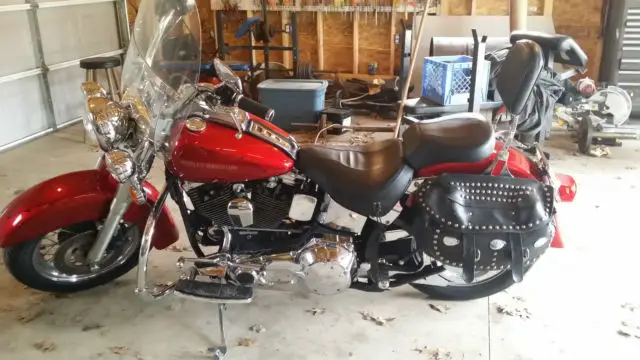 1999 heritage softail classic. custom paint. ance and hines exaust. ew tires. rakes and all oils. a choice of seats and 2 new fenders that just got painted to replace the ones on there if you don't like them. the back fender has a crack that you cant see and the front fender has a spall crack in the paint. other than that the bike is perfect. 7343209891runs and rides great. just got it last week now the wife wants to keep the old one. thanks for looking