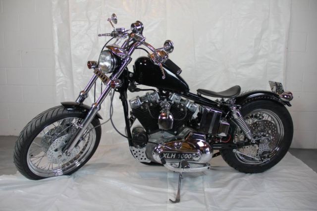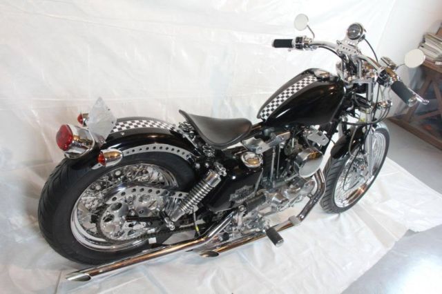 1976 1000cc Sportster. Customized with dual disc. rear late model square tubed swing arm. modified with lightening holes and hanging Brembo caliper. Rear shock mounts relocated to lower bike. Powder coated frame. tanks. fenders. Every single wire has been soldered and heat shrunk. Motor has been dyno tuned by the world famous "Departure Cycle". as seen on Biker Build Off. 16 inch rear wheel. 19 inch front wheel. Stock length front forks. Carburetor an S & S Super E. Many modifications too numerous to list. Bike has current inspection and is ready to ride coast to coast. Bike being sold "as is". no refunds. no returns. If you have questions about the modifications. please e-mail me at kelticdodge@aol. com.