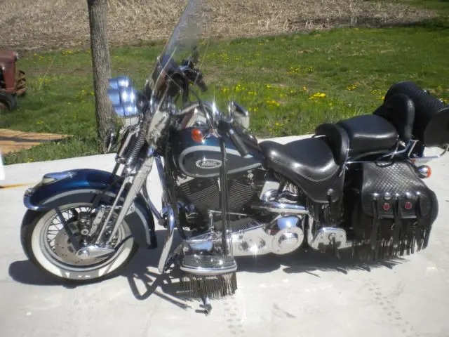 1999 Heritage Softail. 14. 87 actual miles. has many add on accessorys that are now obsolete and expensive. front hub cap. rear luggage rack. rear tootsie roll bag. foot board fringe. drivers low backrest. passenger high backrest. custom Harley footboard inserts front and rear. custom Harley shifter pad. custom Harley brake pad. custom Harley nostalgia grips. custom Harley old style derby cover. custom Harley old style air cleaner cover. Harley chrome upper belt guard. Harley custom softail tool box on right side only. only performance mods are. baffles were removed from fishtail muffers and thrush automotive glass pack mufflers were slipped inside then suppertrapp baffles were installed all you have to do to add or subtract baffles is unbolt the fishtail tip. then the carb had the thunderjet kit installed other than that its all stock. only one noticeable blemish is 3" circle blemish were coating came off windshield in the upper left area (not in drivability area) so only only part this bike needs to be excellent is a new windshield. battery was new last year and has 15 miles on it and was stored in the house on a battery tender all winter. tires are good rear has about 100 miles on it. just started it up today and gave it a bath its ready to ride home. I have a clear title in hand. Harley may finance this through their rider to rider program you can give them a call.