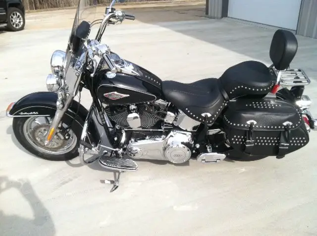 2013 HD Heritage Softail. I bought this bike new and spent 4900. 00 bucks for extras on it. I hope you can see in the pics all of them. I bought this to go and ride with some friends and right after I did two of them had to have back surgery. They got hurt at their jobs and now cannot ride. Since then it has been kept in the garage with a battery tender on it and I have taken some short rides. I have a cover for it and the tender will both go with the bike. This bike has never been hurt in any way. It is like new and the price is alot less than going and buying a new one. If you have any questions please email me here. I check this at work several times a day and will get back to you as soon as possible. Although this bike has low low miles there is no warranty expressed or implied. Shipping is up to the buyer. Thought I would add some of the extras. New seat. heels [both]. loorboards. illit mirrors. ED headlights and taillights. rips. hrome housings on the handlebars that have the controls for lights. orn and start and kill buttons and the electric blue lights on the gas cap to show the fuel level. Also have the chrome drive wheel that the belt goes on. I think there is a few more things just can't remember all right now.