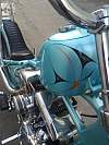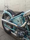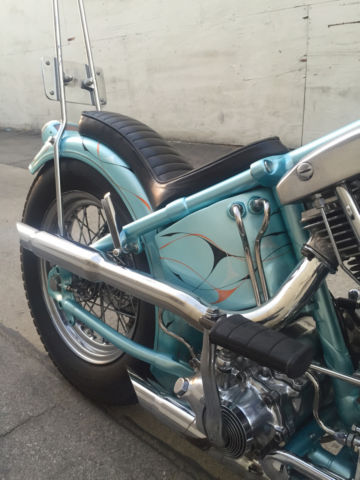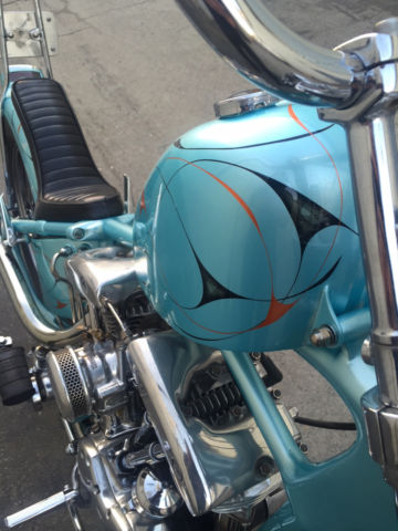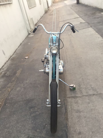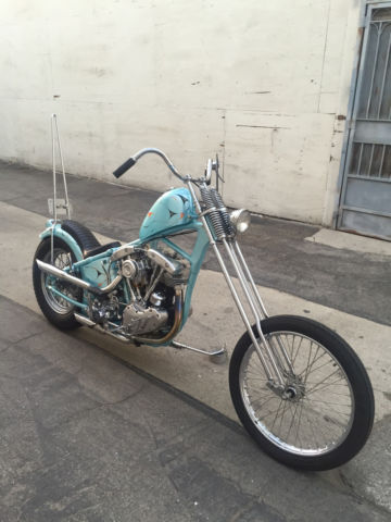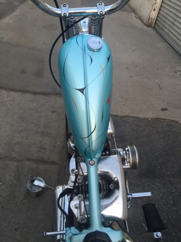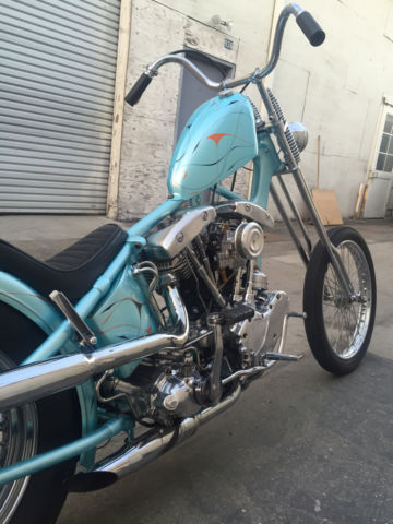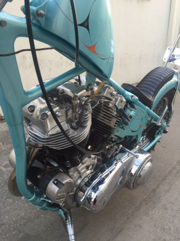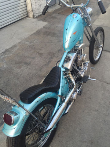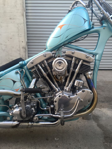Entire bike was built & painted by Bronsonville Custom Cycles in Pomona. CA. This bike was part of the invited builder series for Born Free 4. an invited bike for the 1st Mama Tried motorcycle show in Milwaukee. & an invited bike for Michael Lichter's - motorcycles as art exhibition at the Buffalo Chip in Sturgis. SD. Bike info:•CA titled 1969 Harley Davidson •Engine was built by Rico Fodrey (less than 5k miles on rebuild)•Polished engine cases. cam cover. heads & rocker boxes•Stock flywheels and bore•Andrews "A" grind cam•Solid lifters•S&S super E carb•Polished Panhead 4 speed kick only transmission (also rebuilt)•10" over narrow Century springer •20" WM1 front wheel with narrowed spool hub & Avon tire •16" rear wheel with star hub & Avon tire•VL frame modified to accept a big twin engine•Hand fabricated gas tank•Custom fender/tail light combo•Narrowed horseshoe oil bag•Custom stainless oil lines •Custom mid controls/brake setup•1 1/2" belt drive primary with diaphragm clutch•Custom leather seat made by the Haifley Bros. •Custom sissy bar. exhaust pipes. handle bars & many more hand fabricated parts•Baby blue custom pearl paint by Scott Craig (Bronsonville)