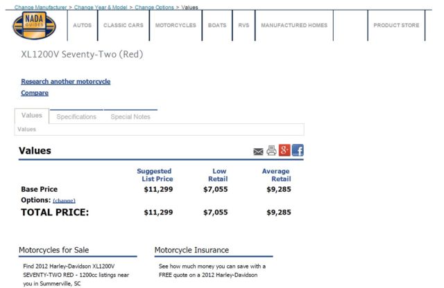 2012 Harley-Davidson Sportster Seventy-TwoBeautiful bike in like new condition. This is a bike featuring authentic '70s chopper attitude met with modern power and premium H-D styling. It is a bare-bones. low rider-inspired radical custom. Bike has just over 2. 00 miles. it is basically brand new. This will continue to rise as I am always on the bike every chance I get. This bike is in near perfect mechanical and cosmetic condition. Featuring a hard candy garnet and black paint job that is a stunning beautiful. The pictures do not do it justice. if you come check out this bike you will fall in love with it. I get compliments everywhere I ride. This is a very tastefully designed bike that looks as if it was heavily modified but is actually completely Harley-Davidson stock with the exception of aftermarket exhaust pipes. There is an HD video online where you can hear the bike run. I cannot post a link. Let me know and I will send you the video. it is a great way to hear and see the bike. Clean and clear title in hand. You put cash in my hand. I put the keys in yours for a test drive. You damage it. you buy it. I have a motorcycle history report on it to prove. no wrecks. theft. or damage. I am asking $8. 90. average retail on this bike is $9. 85 according to NADA. This bike is in excellent cosmetic and mechanical condition. Purchase the bike now and enjoy it through the riding season. If you have any questions at all or would like to come check them out feel free to shoot me a text. email or call. If my ads are still up the item is still for sale. I will take them down immediately upon sale. If you email me asking I will not respond. All the best. reyTxt/Call 843-817-8308 or Email PLEASE only call or text after 8AM or before 11PM Thanks!