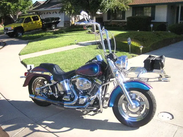 THIS 2002 CUSTOM HARLEY DAVIDSON HERITAGE [RUN FAST AND STRONG] THIS BIKE IS READY TO TAKE YOU ACROSS COUNTRY WITH ON WORRIES. THE MOTOR HAS A 95IN KIT GIVING IT LOTS OF POWER -- THE 5 SPEED TRANZ. HAS TAKEN ME OVER 120 M PH AND I STILL HAD SOME LEFT -- THE BIKE IS LOWERED 1 1/2" -- THE COLOR IS CHAMELEON CHANGES FROM BLUE. URPLE AND GOLD -- THE FENDERS ARE BOBBED AND IT HAS LOTS OF CHROME INCLUDING THE --BARBED WIRE -- ON THE FENDERS AND TANK [see pictures ] -- FOR ADDED TUNING IT HAS THE DYNO JET POWER COMMANDER -- THUNDER HEADER PIPES --16" APES -- 2 SEATS -- SISSY BAR -- ADJUSTABLE BITCH PEGS -- HWY PEGS-- SADDLE BAGS -- T- BAG -- WINDSHIELD -- GOOD TIRES -- CUSTOM WHEELS -- ALL ROUND GREAT RIDER -- ONLY 66556 MILES - - THERE IS NOTHING WRONG WITH THIS BIKE -- THE SHIPPING OR PICK UP IS UP TO YOU -- PAYMENT OF $500. 00 DEPOSIT AND BALANCE IN CASH ON PICK UP WITH IN 7 DAYS --- -- IF YOU HAVE QUESTIONS CONTACT ME WITH YOUR PHONE # I WILL CALL YOU [ADDED NOTE ---THE HEADERS ARE BLUED GOT A LITTLE HOT ABOUT 6 YR. S A-GO] ------ S. P. ADDED NOTE THIS BIKE IS FOR SALE LOCALLY IF I SELL IT BEFORE AN OFF IS MADE I WILL THAKE THIS ADD DOWN THANK YOU FOR LOOKING