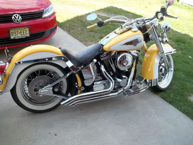 1995 HERITAGE WITH CLEAN AND CLEAR HD TITLE COMES AS SHOWN SPOTLESS. LOOKS LIKE IT ROLLED OFF THE SHOWROOM FLOOR AND SOMEONE CHROMED THE CRAP OUT OF IT. CHROME LOWERS. EW WHITEWALL TIRES. ROUND POUNDER SAMSON PIPES. FAT DADDY BEACH BARS AND ALL BRAIDED CABLES. FACTORY PERFECT TANKS AND FENDERS WITH A FEW CUSTOM TOUCHES AND FEATHER AIRBRUSH. THIS BIKE IS CLEAN AND CLEAN GETS. RUNS AND RIDES BETTER THAN NEW. ALWAYS TAKEN CARE OF. EVERYONE HAS A TWINCAM. DONT BE LIKE EVERYONE ELSE. EVO IS THE ONLY WAY TO GO. WHEN TAKEN CAE OF THEY WILL RUN FOR EVER. NO COMPUTER CRAP. IN MY OPINION THE BEST MOTOR HARLEY CAME OUT WITH. ANY QUESTIONS PLEASE CALL 609-464-8983 OVER SEAS BUYERS WELCOME AS LONG AS YOU UNDERSTAND THAT DEPOSIT ONLY THREW PAYPAL. BALANCE BY WIRE TRANSFER OR CASHIERS CHECK. ONLY WHEN FUNDS CLEAR MY BANK WILL I RELEASE THE BIKEOn May-02-15 at 08:50:55 PDT. seller added the following information:Reserve lowered to 7500. That's as low as I will go. I have a few other bikes that will sell an have no problem keeping this one for myself.