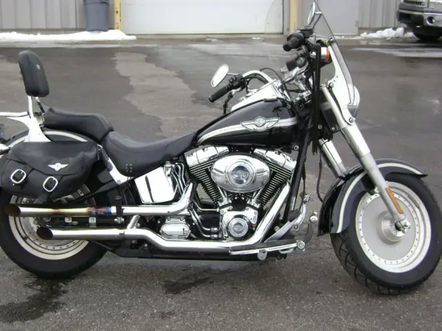 you are looking at a very nice Harley Davidson 2003. fuel injected 100 year anniversary black on black Fatboy. I bought it new. all services have been done as well as oil changes. it has a detachable windshield. Leather fatboy bags very comfortable highway pegs. exhaust pipe tips that have a really nice sound. I had no intention in selling this bike and was going to ride it for many years but I happened to run across my dream bike at the right price. I will miss this bike when it is gone but I cannot keep both bikes.