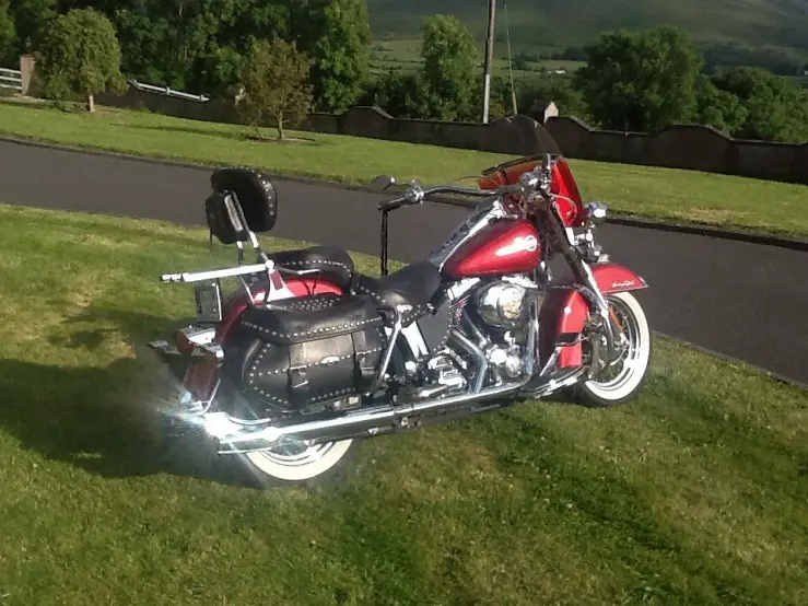 I have thought long & hard about selling this bike as i have put so much time & money into making it one of the most comfortable cruisers on the road with padded seats & wide beech bars which will give you great circulation & help prevent pins & needles in the fingers. the fishtail exhausts give a lovely throaty sound but are not offensive on a long run. But the reality is I now spend more time away in the motorhome. but really miss the bike so I bought a hydra-trail & a scooter. but after riding this the scooter just does not cut it & this is just too heavy & as I have always believed in having one bike that you ride as opposed to a collection just for show. I have to get something smaller. but it will have to be a HARLEY. Whoever buys this will not be disappointed & will get years of trouble free fun. Maybe someone has a Sportster & is looking to trade up to a cruiser. if so contact me & we may be able to deal. I have uploaded new photos that show clearer the condition of the bike & might help all those of you that were watching to make up their mind. Every year the bike has been put up on a lift & the saddlebags etc removed & the complete bike given a coat of protective waxThe saddlebags & indeed all the leather was also then treated with a protective wax especially for leather. but don't just take my word for it where else have you seen saddlebags this firm or a saddle without any age related cracks or wear. Look at the tyres where else have you seen whitewalls this clean. This bike has always been maintained by a main dealer & will have a full service & new battery prior to collection. If you want to talk feel free to send me a message with your number & I will call you back. Or you can direct dial my mobile from anywhere in the world 00353872247357 This is my one owner 2004 Harley-Davidson Heritage Softail with the following dealer fitted genuine HD extrasFishtail exhausts1/14 inch internally wired beach barsWhitewall tyresAll chrome switchingExtra comfort studded passenger seat & backrestRider & passenger floorboards with flame insertsArlen Ness mirrorsLuggage rackFront & rear crash barsHelmet lockAir HornsLight & indicator visorsStudded leather mudflapCruising pegsChrome tank panelBraided brake linesMemphis Shades colour matched removable screenHas always been stored in a heated garageThis is a 100% genuine ONE OWNER motorcycleI have 100% feedback from over 500 transactions on ebayI am 1 hour from Rosslare ferry terminal & less than 2 hours from Dublin & can collect the winning bidder I can also assist with shipping worldwide. or arrange a suitable courier at buyers expense£250 deposit by PayPal balance in cash on collection (I will accept sterling or euros)Advertised elsewhere so may be removed at any timeWILL BE SERVICED BY A MAIN HARLEY DAVIDSON DEALER PRIOR TO COLLECTIONOnly selling as I am looking for something smaller (less than 250 kgs) to bring behind Motorhome. May consider Sportster as part of the deal. feel free to contact meThanks for looking & good luck. John.