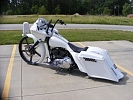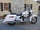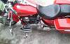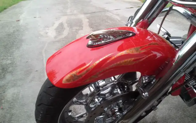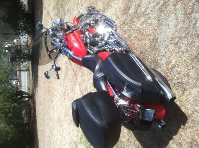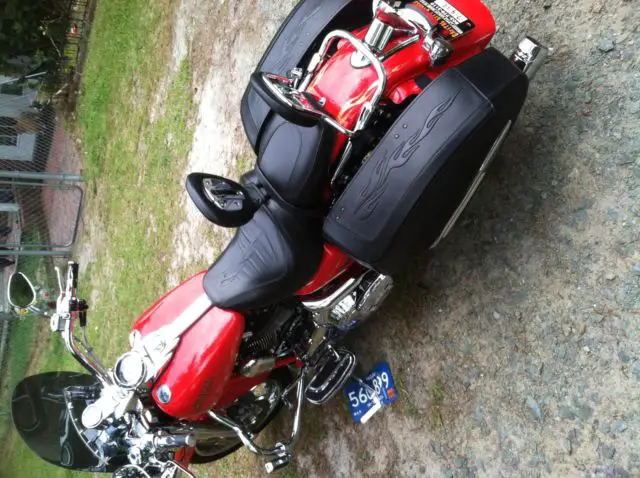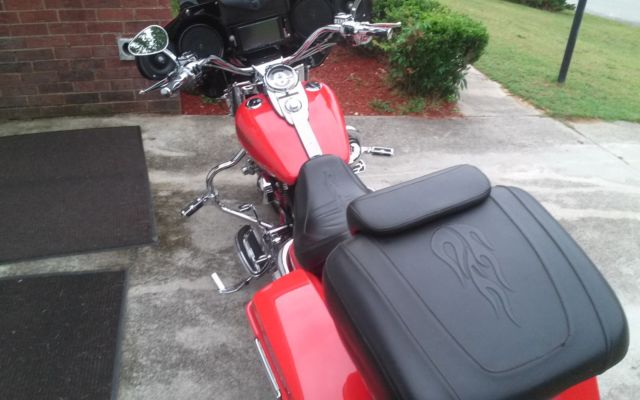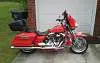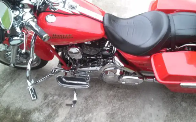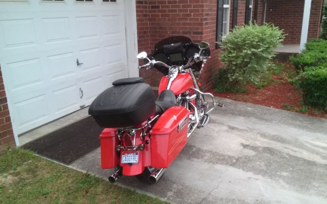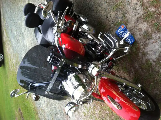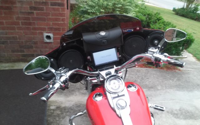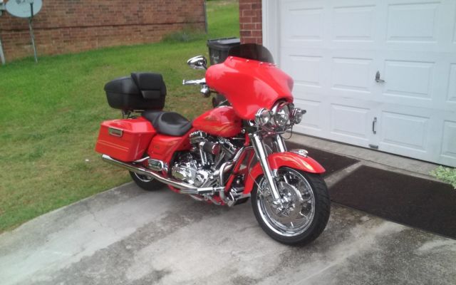 2007 Road King CVO in Razor Red. This bike is dripping in chrome. I added a Hoppe fairing with a Eclipse 7" dvd nav. There are 2 6.5 kicker subs with the kicker amp. 2 6.5 speakers and 2 5.25 in the fairing. 2 6x9s in the bags. There is a true chrome inner primary. I have the leather saddle bags and windshield. I have the CVO cover but no key. I am the second owner. I have a back up camera for mounting on rear plate. I replaced the tires when I bought it with 18k on it. No leaks and runs awesome. No trades. There is a loan on it. Buyer responsible for shipping costs. This bike is indoors most of the time. Oil changed at 1000 miles every time. I added a cooling fan on the oil cooler. More pics available on request. Rhinehart true duals.