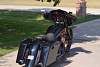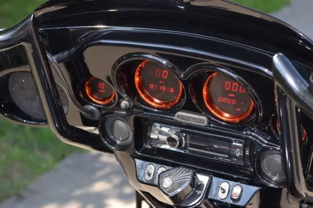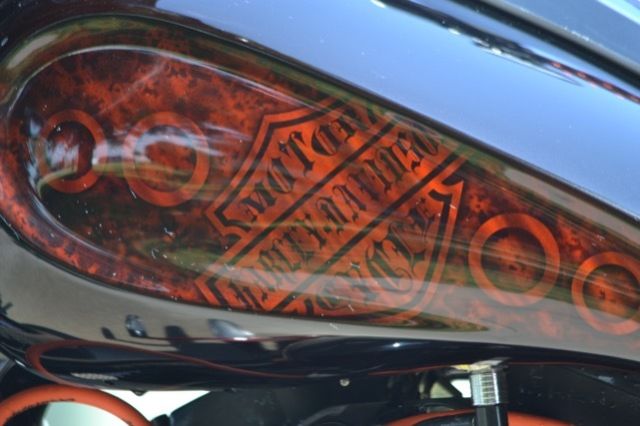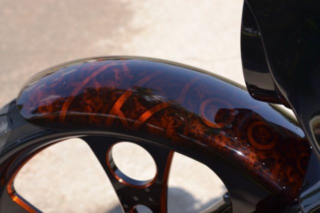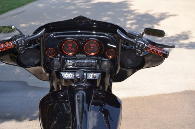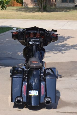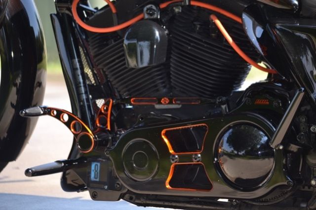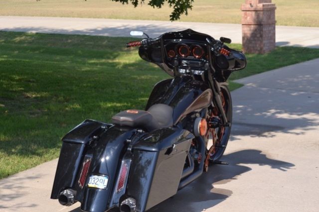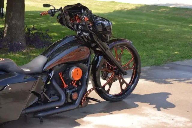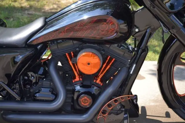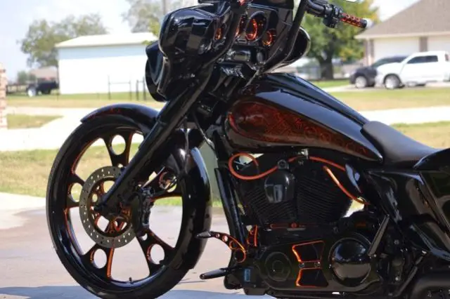 Custom Street Glide 2009 motor is a 107 cubic inch 26 inch front wheel custom paint and graphics black and candy orange stereo with 2 amps and 6 speakers hand made seat custom headlight sequential turn signals (like in a mustang) open primary air ride rear end with center stand custom cover and more